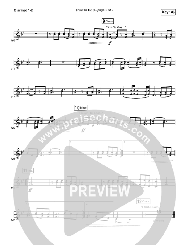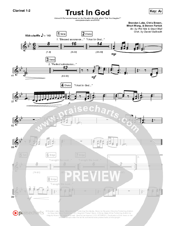 Download the Clarinet sheet music for Trust In God (Unison/2-Part) by Elevation Worship / Chris Brown / Arr. Phil Nitz, from the album Can You Imagine?. This song was arranged by Phil Nitz / Daniel Galbraith / Grant Wall in the key of Ab.