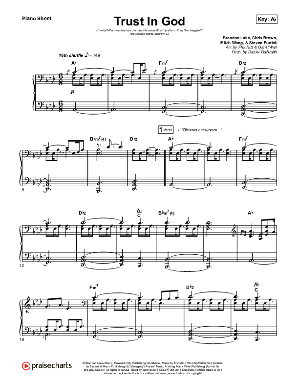 Download the piano sheet for Trust In God (Unison/2-Part) by Elevation Worship / Chris Brown / Arr. Phil Nitz, from the album Can You Imagine?. This song was arranged by Phil Nitz / Daniel Galbraith / Grant Wall in the key of Ab.
