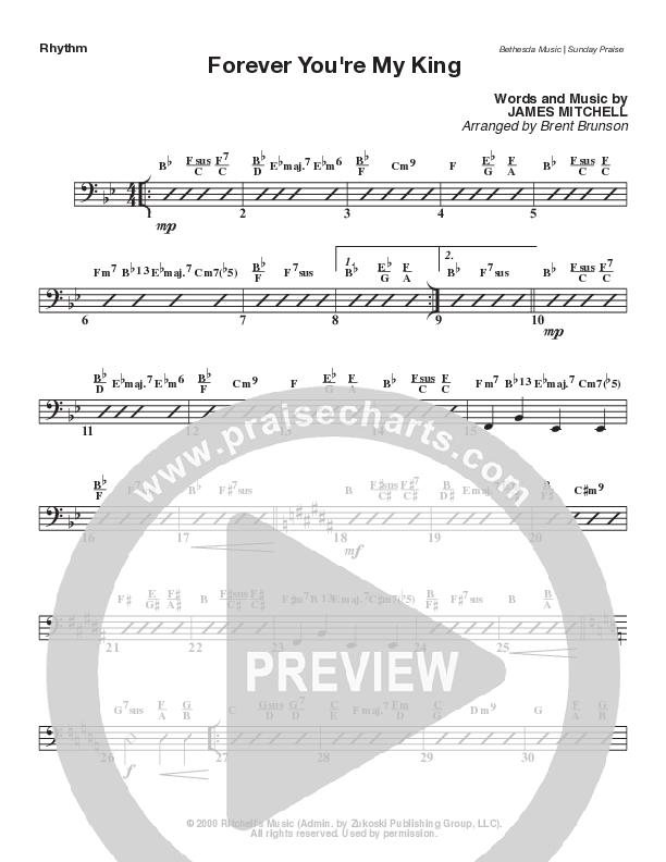 Download the Rhythm Chart for Forever You're My King (Live) by Bethesda Music / Arr. Brent Brunson, from the album Sunday Praise | Everlasting God (Live). This song was arranged by Brent Brunson in the key of Bb.
