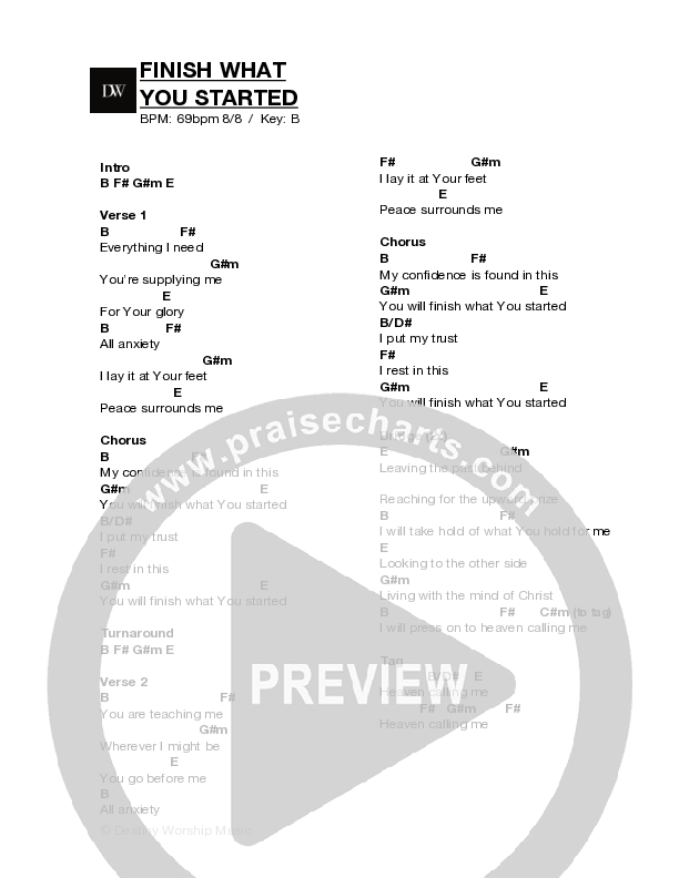 Download the PDF Chord Charts for Finish What You Started (Live) by Destiny Worship Music, from the album DWM | Live.