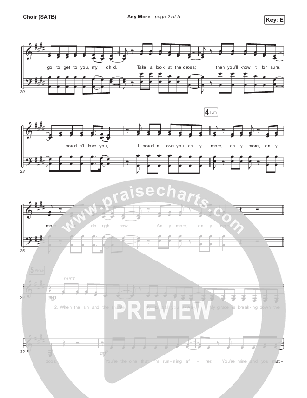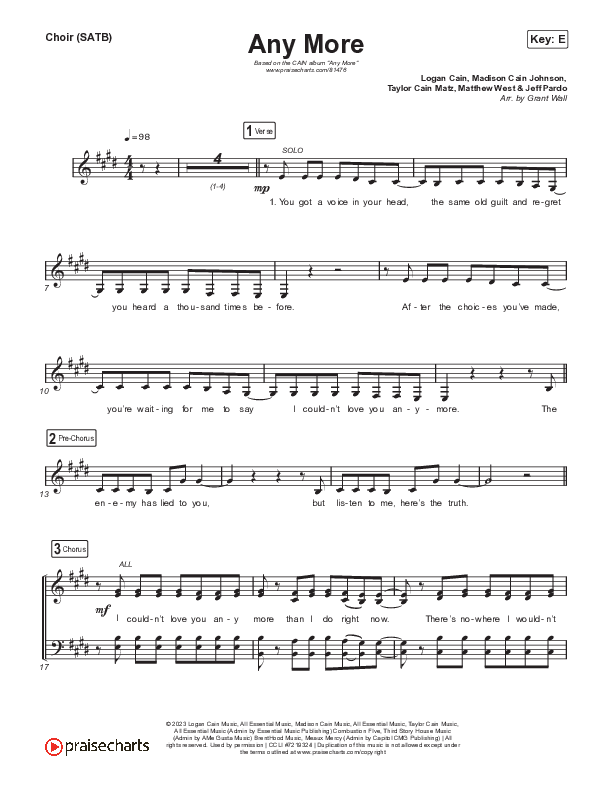 Download the Choir Sheet for Any More by CAIN, from the album Jesus Music. This song was arranged by Grant Wall in the key of E, Eb.