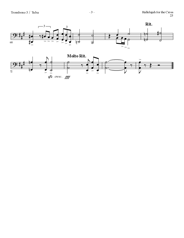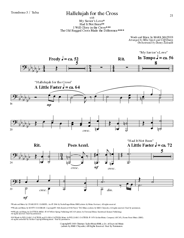 Download the Trombone 3/Tuba sheet music for Hallelujah For The Cross (with My Savior's Love, Had It Not Been, I Will Glory In The Cross, The Old (Choral Anthem SATB) by Lillenas Choral / Arr. Mike Speck / Arr. Cliff Duren / Orch. Danny Zaloudik, from the album Easter Choral Anthems. This song was arranged by Mike Speck / Cliff Duren / Danny Zaloudik in the key of Gb.