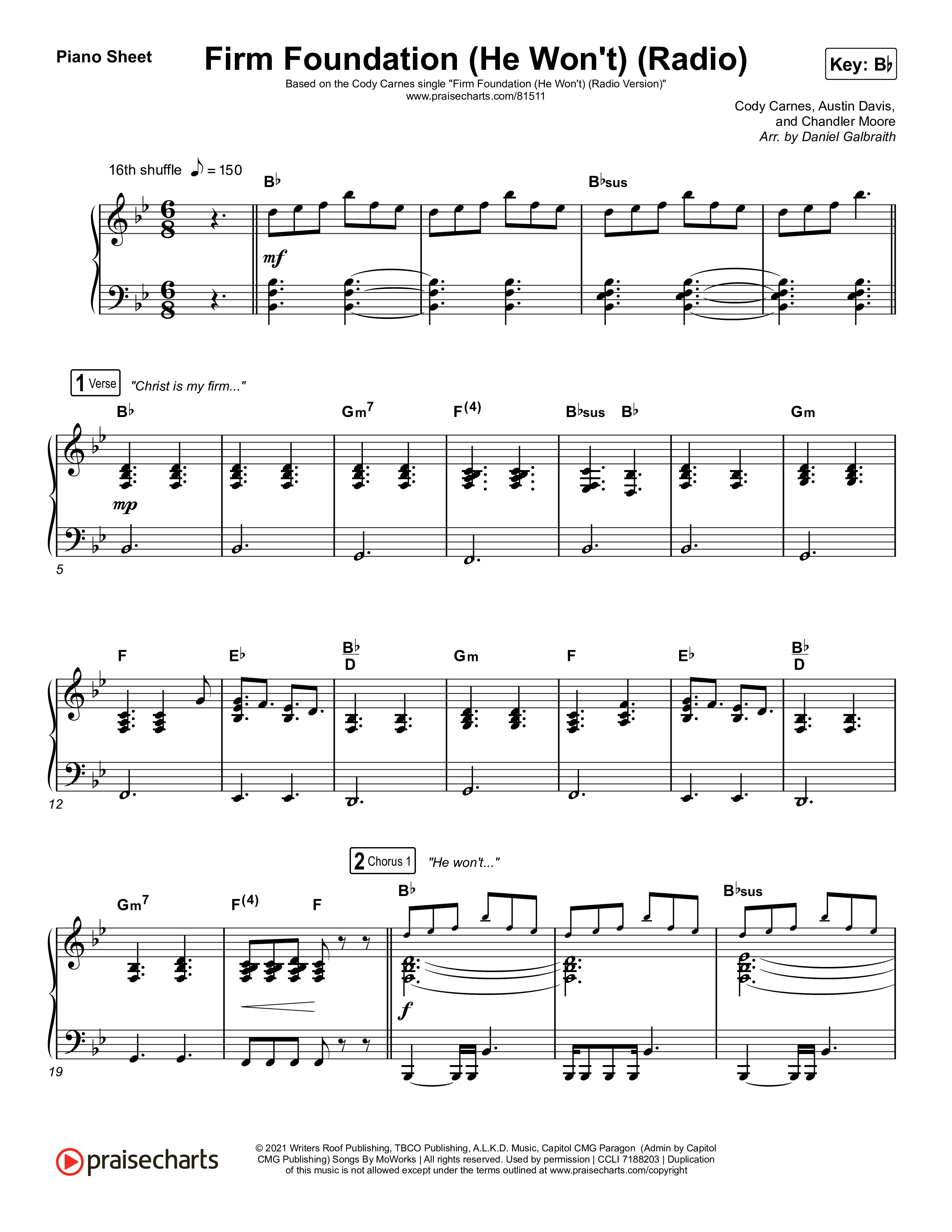 Download the piano sheet for Firm Foundation (He Won't) (Radio) by Cody Carnes, from the album Firm Foundation (He Won't) (Radio). This song was arranged by Daniel Galbraith in the key of A, Bb, G.