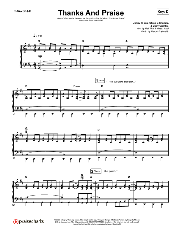 Download the piano sheet for Thanks And Praise (Unison/2-Part) by Songs From The Soil / Lucy Grimble / Philippa Hanna / Rich DiCas / Arr. Phil Nitz, from the album Thanks And Praise. This song was arranged by Phil Nitz / Daniel Galbraith / Grant Wall in the key of D.
