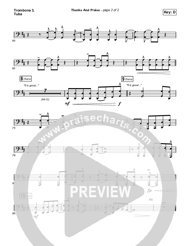 Download the Trombone 3/Tuba sheet music for Thanks And Praise (Unison/2-Part) by Songs From The Soil / Lucy Grimble / Philippa Hanna / Rich DiCas / Arr. Phil Nitz, from the album Thanks And Praise. This song was arranged by Phil Nitz / Daniel Galbraith / Grant Wall in the key of D.