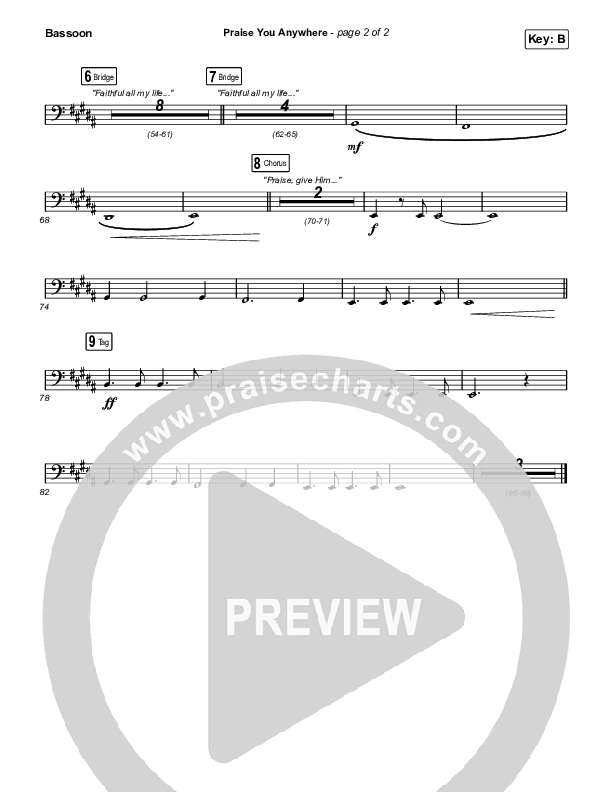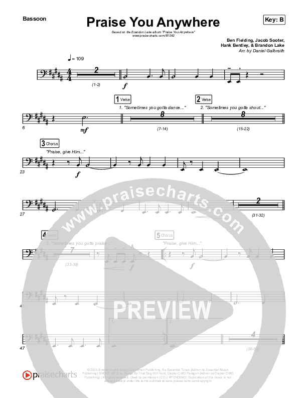Download the Bassoon sheet music for Praise You Anywhere by Brandon Lake, from the album Coat Of Many Colors. This song was arranged by Daniel Galbraith in the key of A, B, Bb, G.