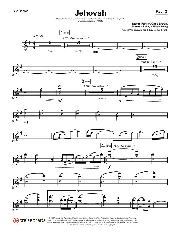 Download the Violin sheet music for Jehovah (Unison/2-Part) by Elevation Worship / Chris Brown / Arr. Mason Brown, from the album Can You Imagine?. This song was arranged by Mason Brown / Daniel Galbraith in the key of G.