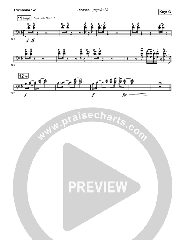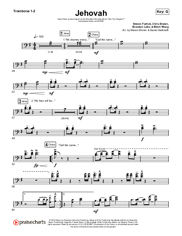 Download the Trombone 1,2 sheet music for Jehovah (Sing It Now) by Elevation Worship / Chris Brown / Arr. Mason Brown, from the album Can You Imagine?. This song was arranged by Mason Brown in the key of G.