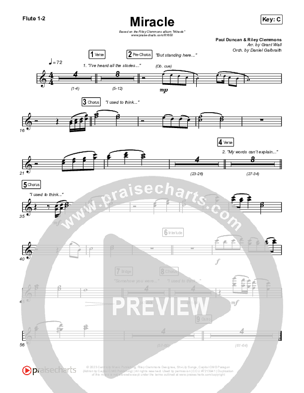 Download the Flute sheet music for Miracle by Riley Clemmons, from the album Miracle. This song was arranged by Grant Wall / Daniel Galbraith in the key of Bb, C.