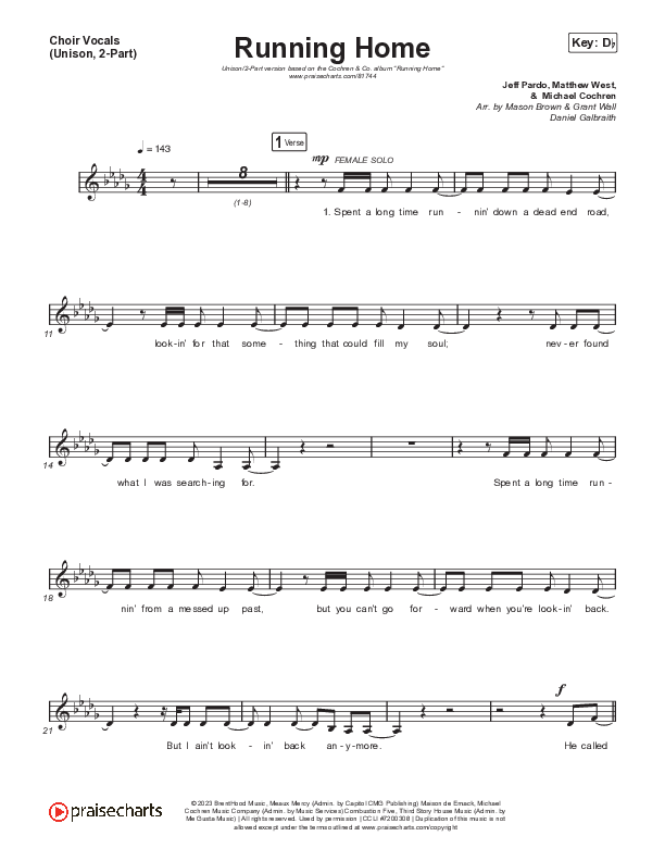 Download the PDF sheet music for Running Home (Unison/2-Part) by Cochren & Co / Arr. Mason Brown, from the album Running Home. This song was arranged by Mason Brown / Daniel Galbraith / Grant Wall in the key of Db.