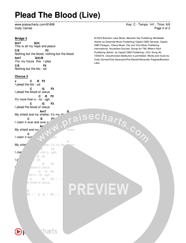 Download the PDF Chord Charts for Plead The Blood (Live) by Cody Carnes, from the album Firm Foundation. This song was arranged by Grant Wall in the key of C, Db.