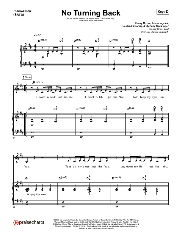 Download the PDF sheet music for No Turning Back by Steffany Gretzinger / Leeland, from the album The Narrow Way. This song was arranged by Grant Wall / Daniel Galbraith in the key of D, Eb.