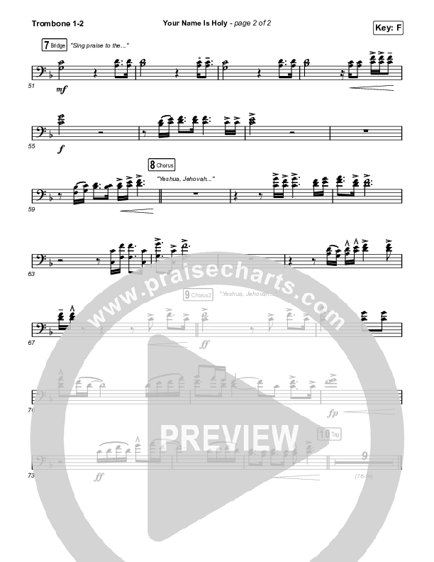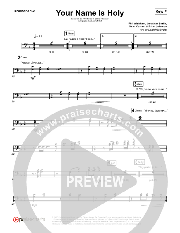 Download the Trombone 1,2 sheet music for Your Name Is Holy by Phil Wickham, from the album I Believe. This song was arranged by Daniel Galbraith in the key of F, Gb.
