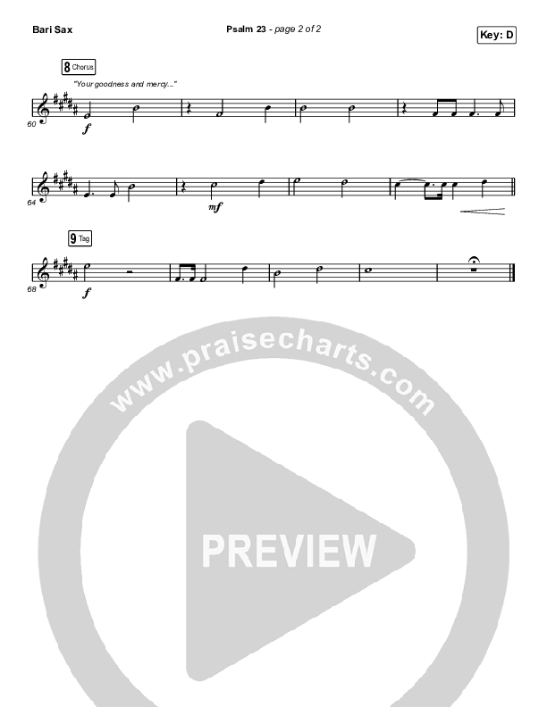 Download the Bari Sax sheet music for Psalm 23 by Phil Wickham / Tiffany Hudson, from the album I Believe. This song was arranged by Grant Wall / Daniel Galbraith in the key of C, D.