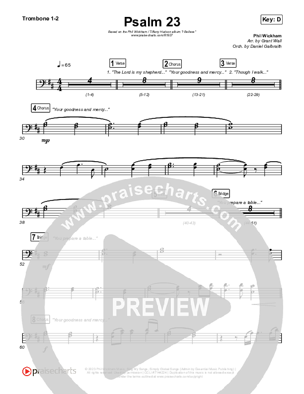 Download the Trombone sheet music for Psalm 23 by Phil Wickham / Tiffany Hudson, from the album I Believe. This song was arranged by Grant Wall / Daniel Galbraith in the key of C, D.