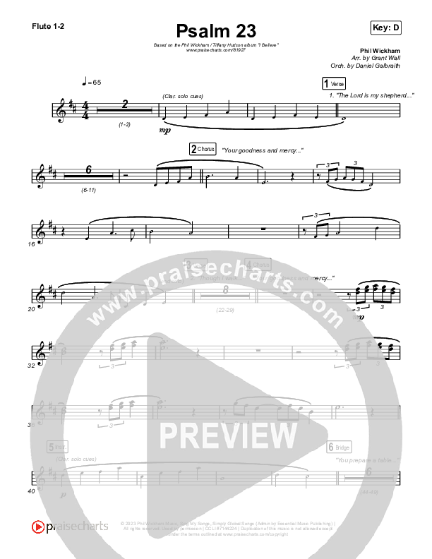 Download the Orchestration wind parts for Psalm 23 by Phil Wickham / Tiffany Hudson, from the album I Believe. This song was arranged by Grant Wall / Daniel Galbraith in the key of C, D.