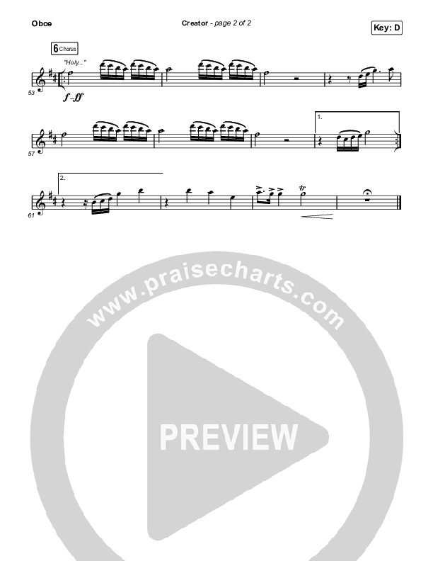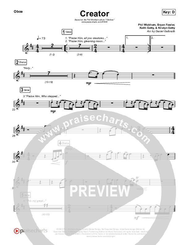 Download the Oboe sheet music for Creator by Phil Wickham, from the album I Believe. This song was arranged by Daniel Galbraith in the key of C, D.