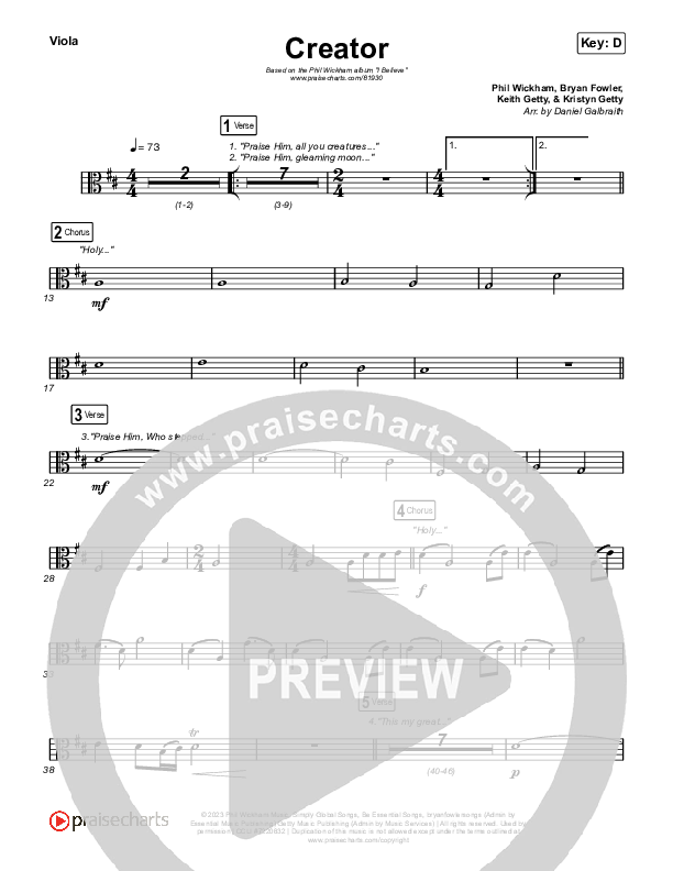 Download the Viola sheet music for Creator by Phil Wickham, from the album I Believe. This song was arranged by Daniel Galbraith in the key of C, D.