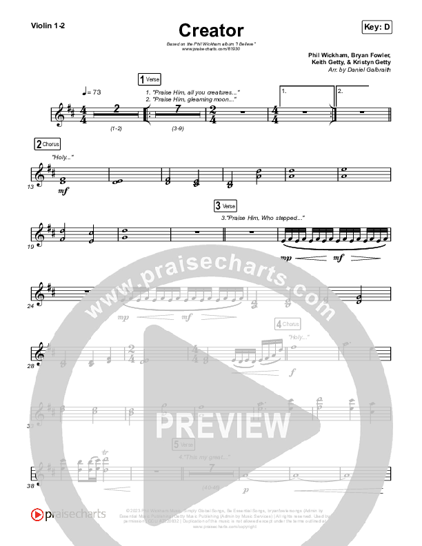 Download the Violin sheet music for Creator by Phil Wickham, from the album I Believe. This song was arranged by Daniel Galbraith in the key of C, D.