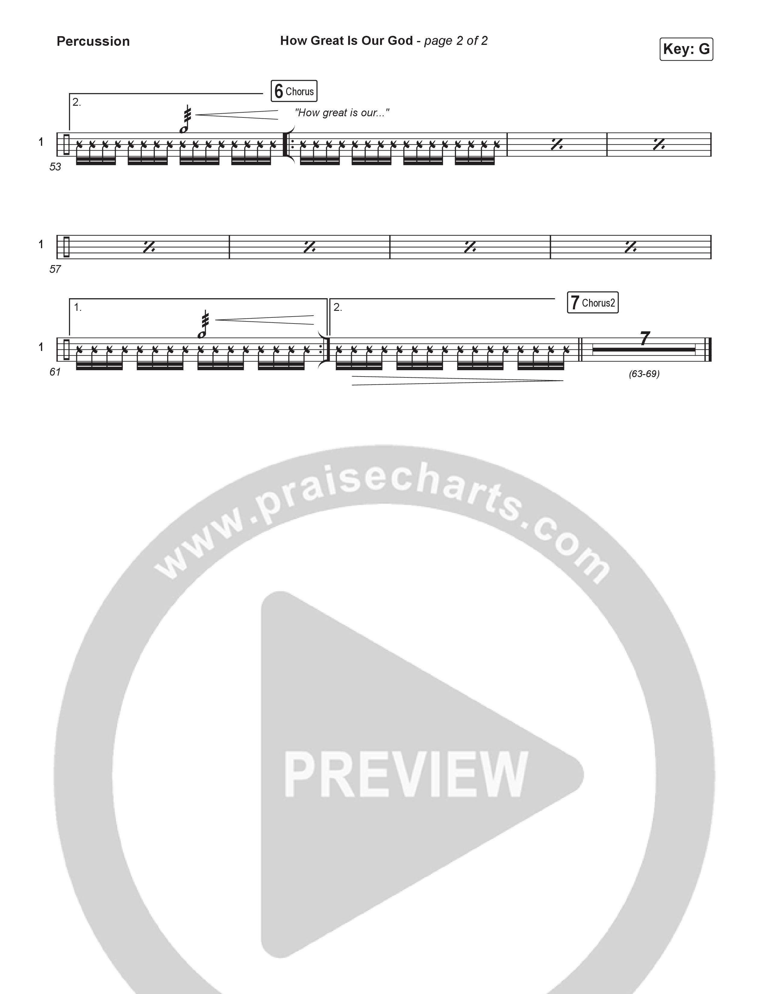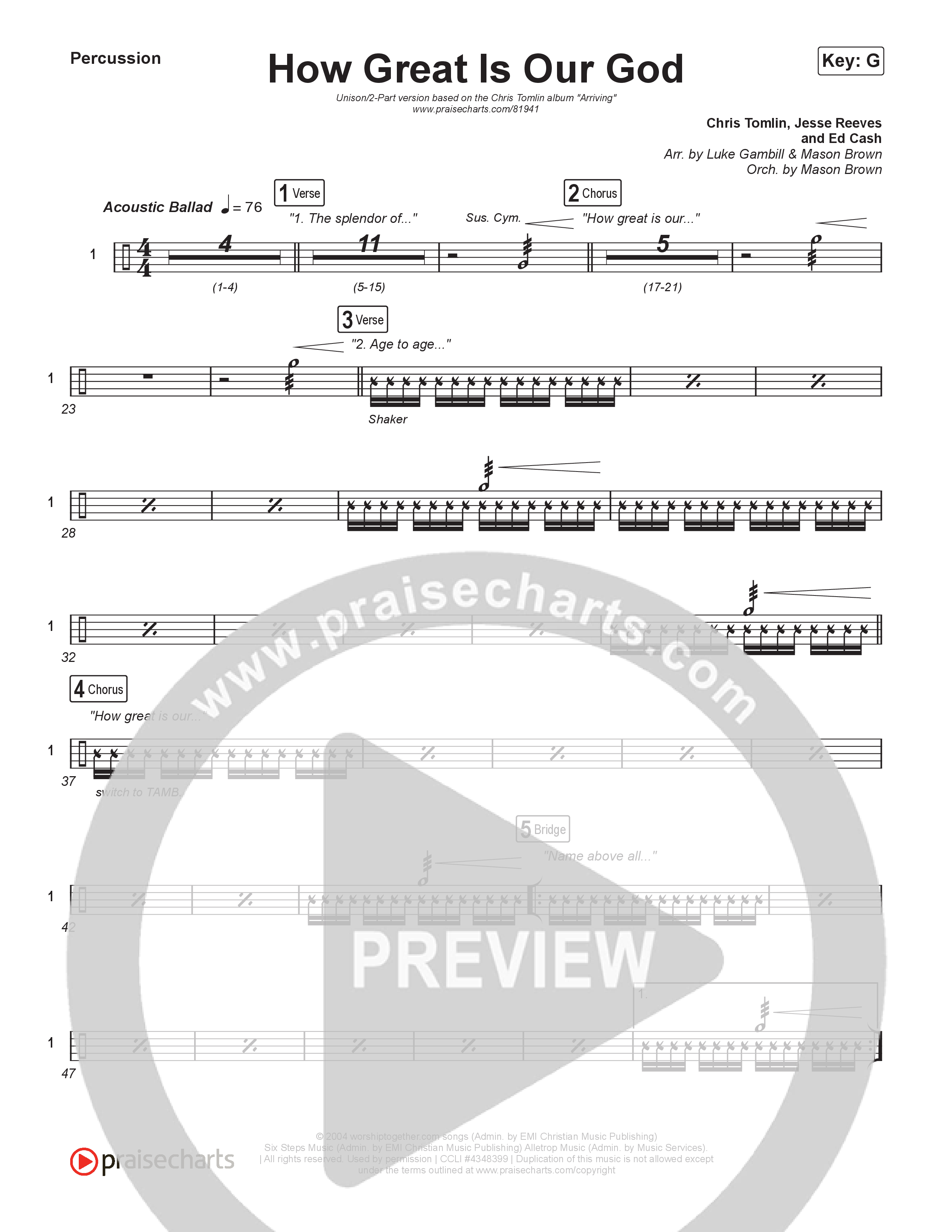 Download the percussion sheet music for How Great Is Our God (Unison/2-Part) by Chris Tomlin / Arr. Luke Gambill / Orch. Mason Brown, from the album Arriving. This song was arranged by Luke Gambill / Mason Brown in the key of G.
