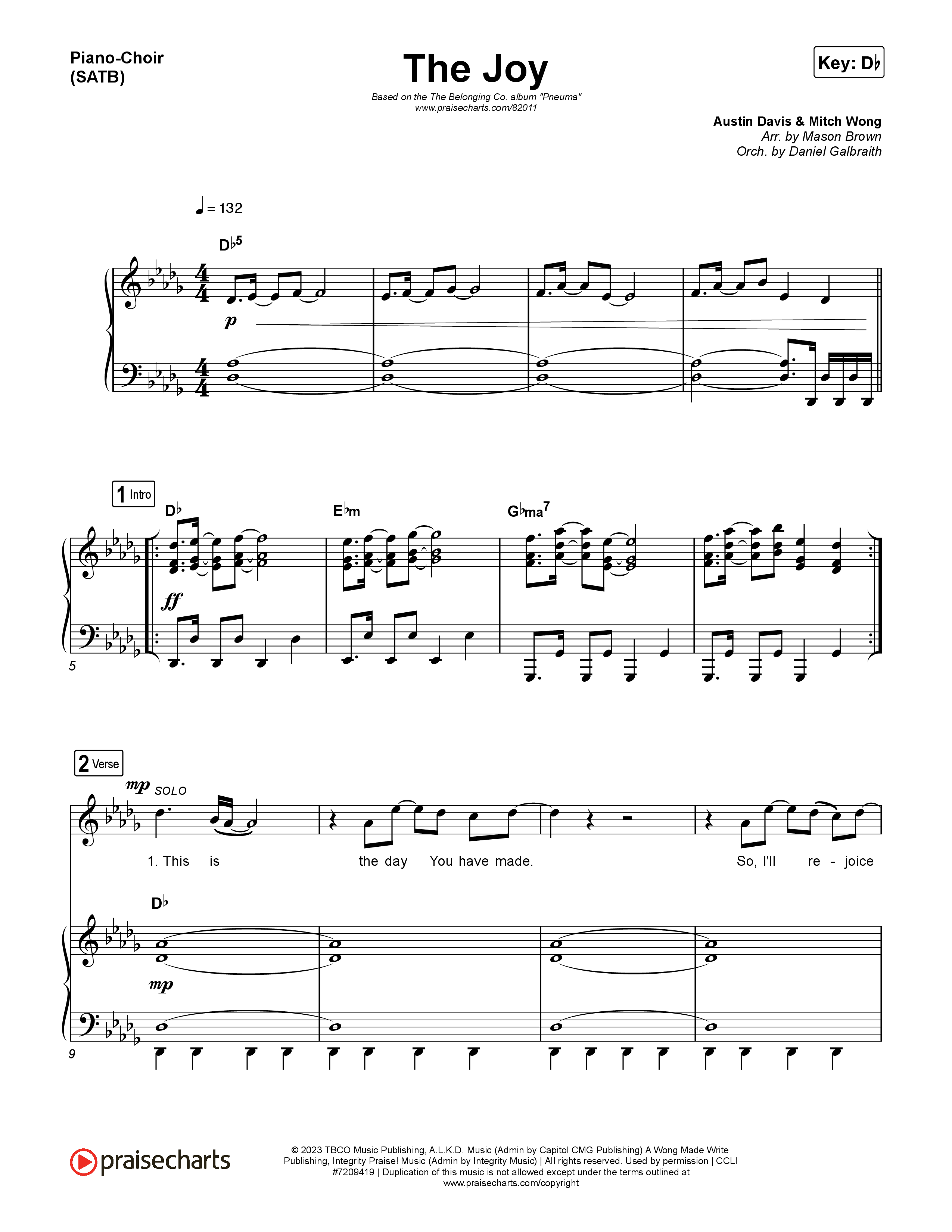 Download the PDF sheet music for The Joy (Live) by The Belonging Co / Andrew Holt, from the album Pneuma. This song was arranged by Mason Brown / Daniel Galbraith in the key of Bb, C, Db.