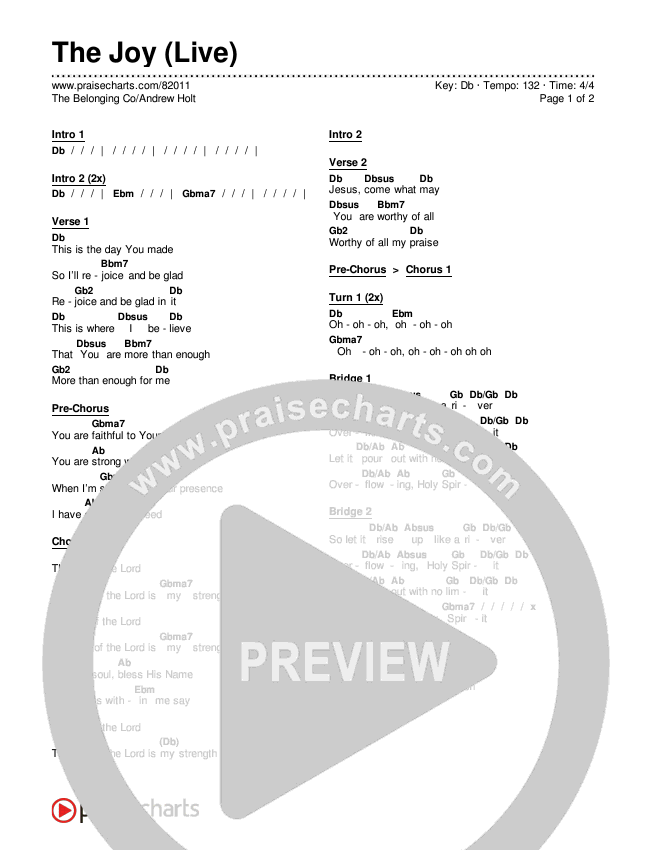 Download the PDF Chord Charts for The Joy (Live) by The Belonging Co / Andrew Holt, from the album Pneuma. This song was arranged by Mason Brown / Daniel Galbraith in the key of Bb, C, Db.
