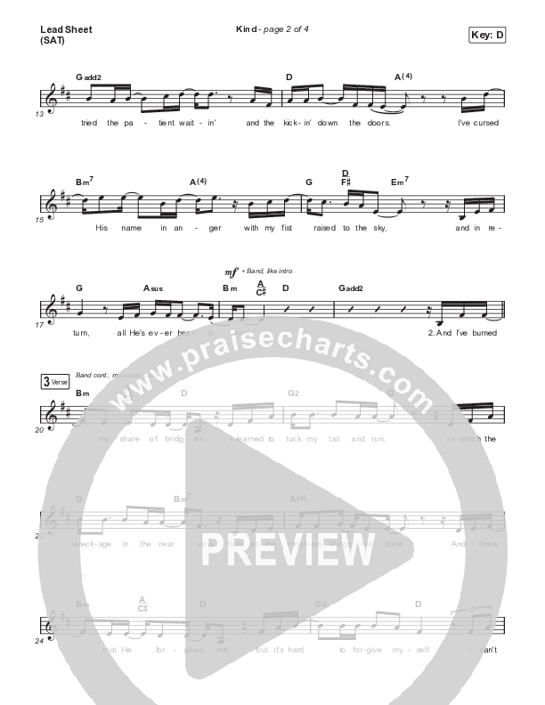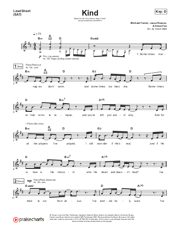 Download the sheet music for Kind by Cory Asbury, from the album Kind. This song was arranged by Grant Wall in the key of C, D.