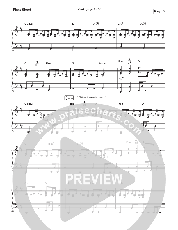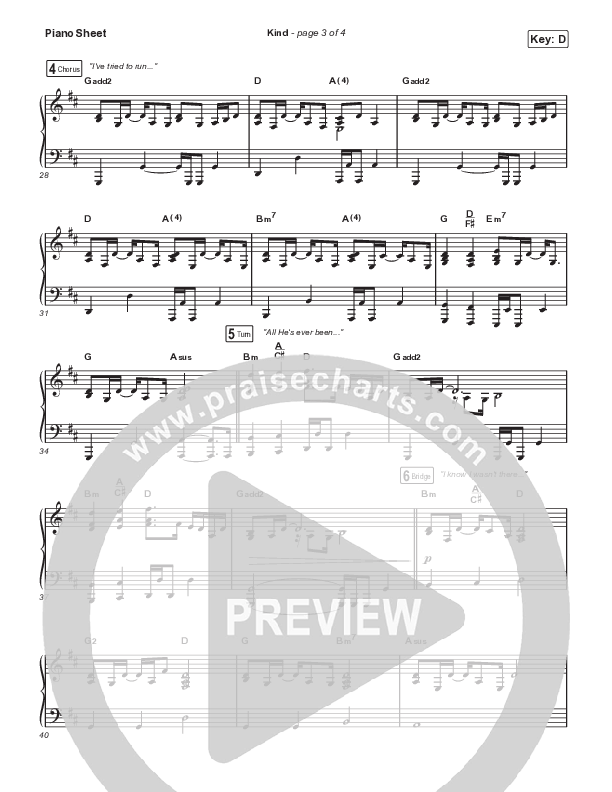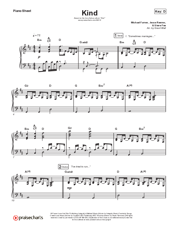 Download the piano sheet for Kind by Cory Asbury, from the album Kind. This song was arranged by Grant Wall in the key of C, D.