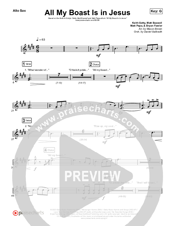 Download the AltoSax sheet music for All My Boast Is In Jesus by Matt Boswell / Matt Papa / Keith & Kristyn Getty, from the album I Set My Hope On Jesus. This song was arranged by Mason Brown / Daniel Galbraith in the key of F, G.