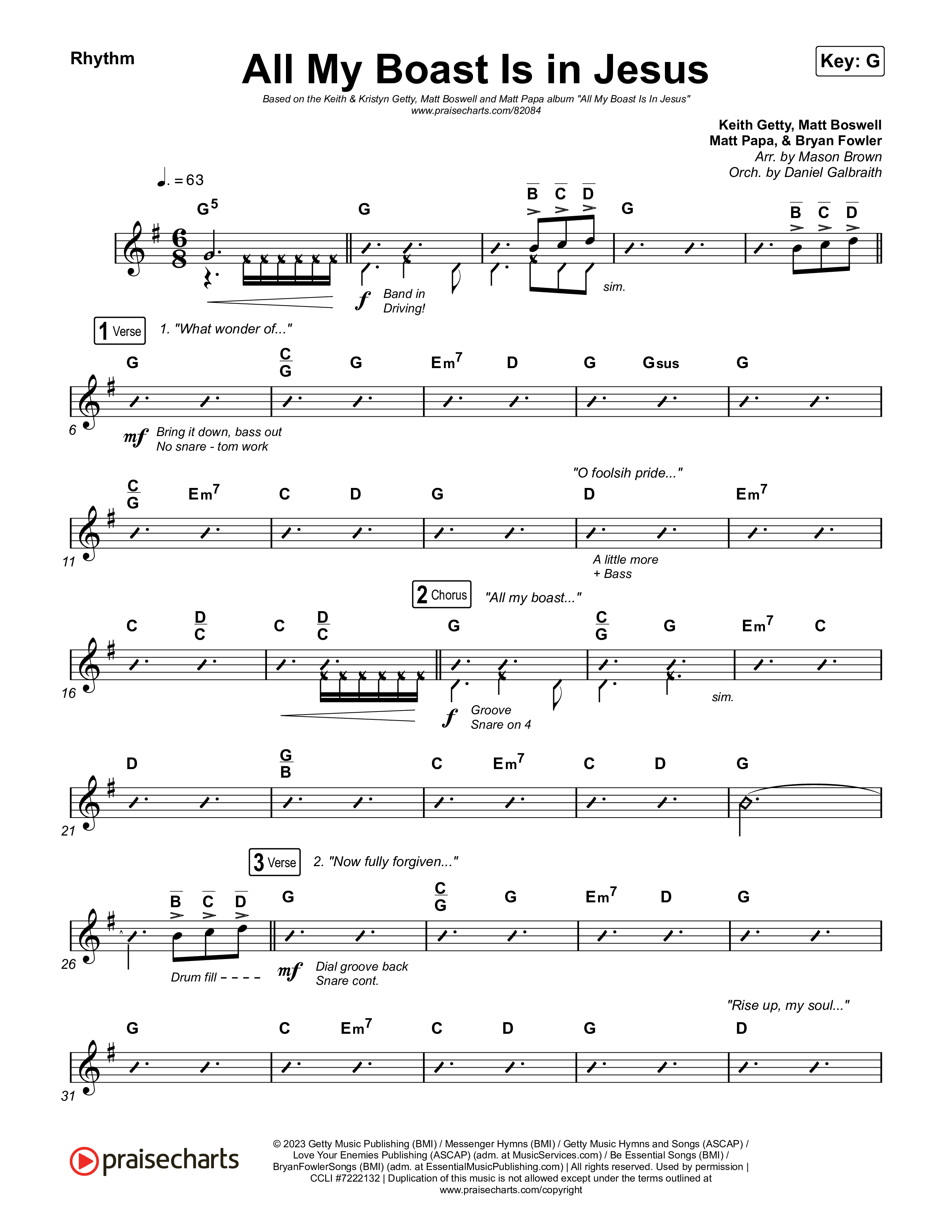 Download the Rhythm Chart for All My Boast Is In Jesus by Matt Boswell / Matt Papa / Keith & Kristyn Getty, from the album I Set My Hope On Jesus. This song was arranged by Mason Brown / Daniel Galbraith in the key of F, G.