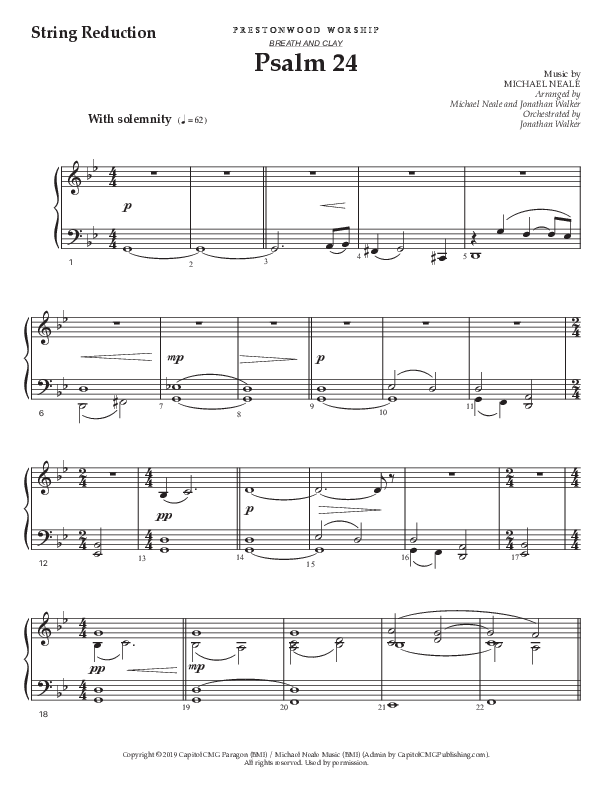 Download the String Reduction sheet music for Psalm 24 (Choral Anthem SATB) by Prestonwood Worship / Prestonwood Choir / Arr. Jonathan Walker / Orch. Michael Neale, from the album Breath And Clay. This song was arranged by Jonathan Walker / Michael Neale in the key of Bb.
