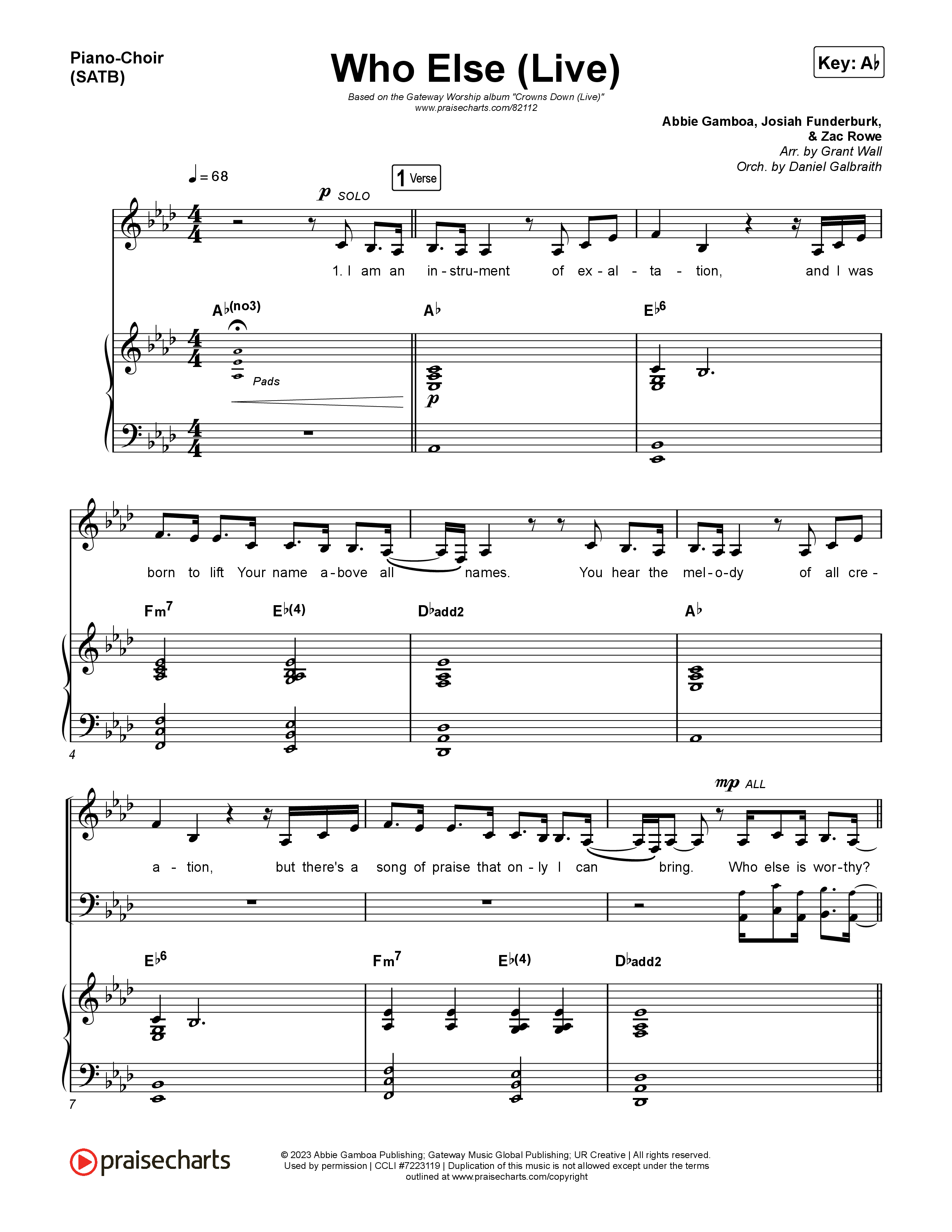 Download the sheet music for Who Else (Live) by Gateway Worship / Claire Smith, from the album Crowns Down (Live). This song was arranged by Grant Wall / Daniel Galbraith in the key of Ab, G.