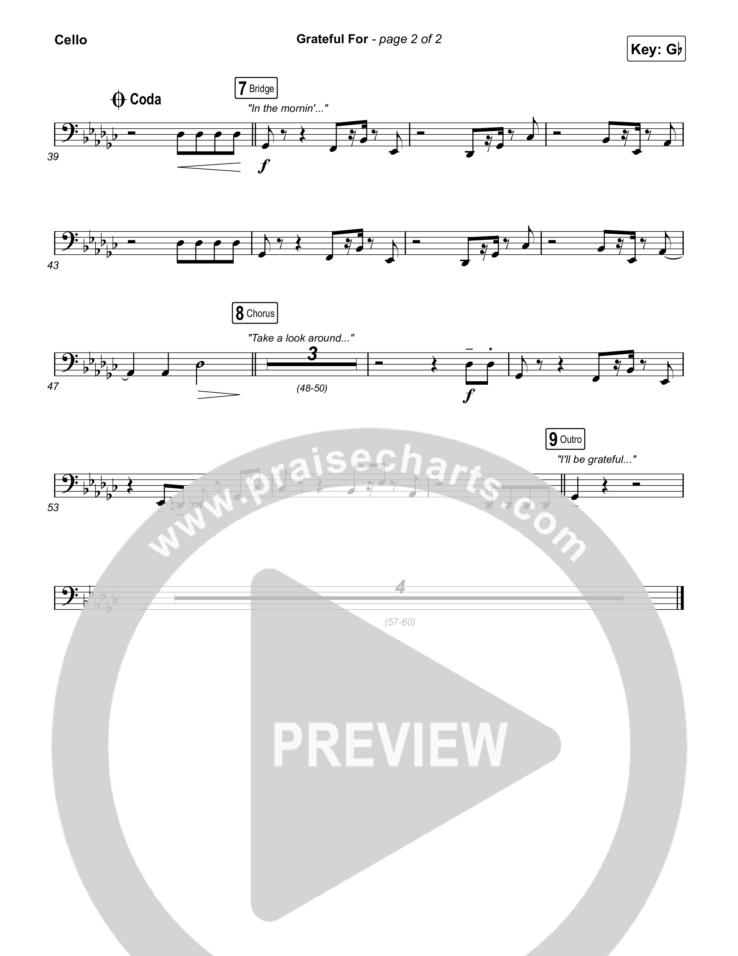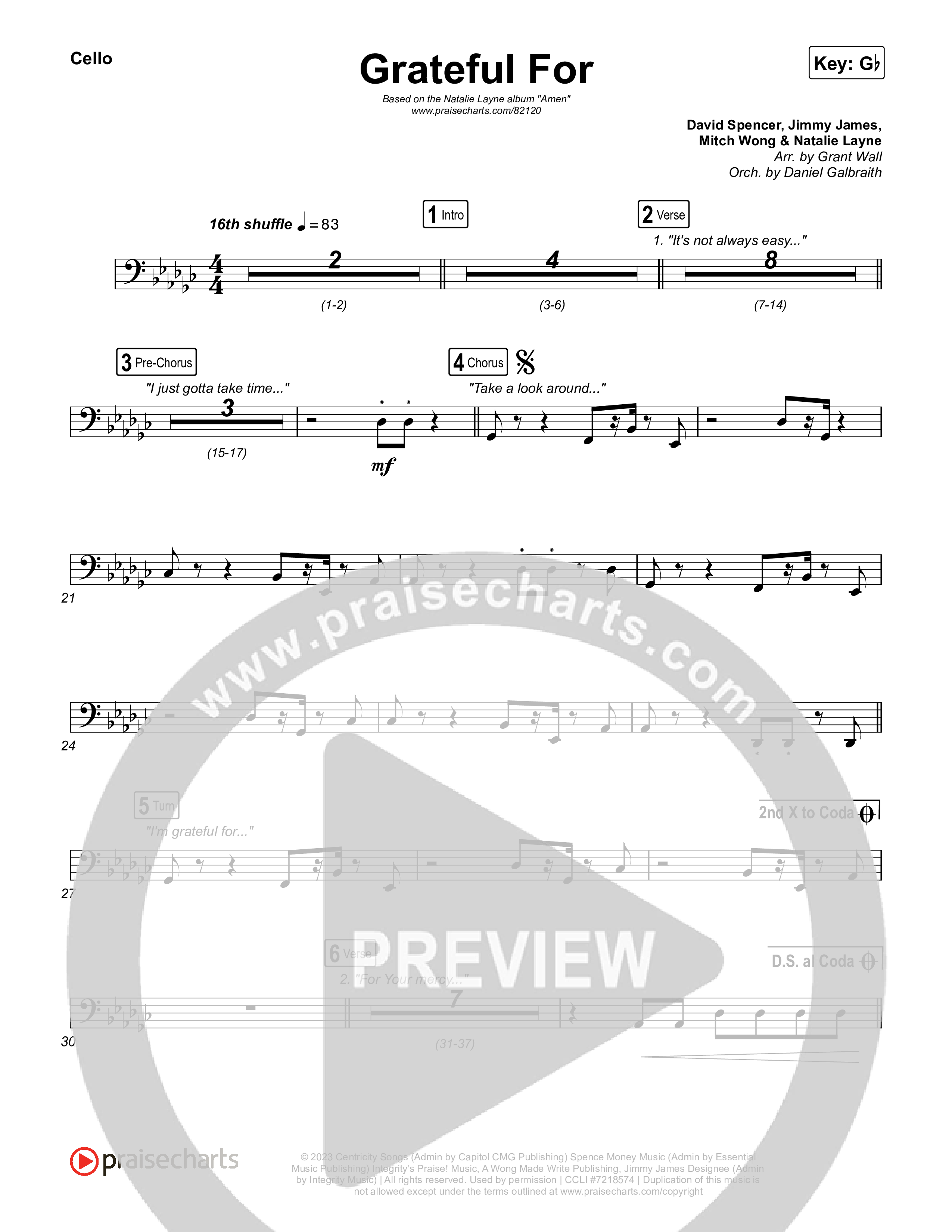 Download the Cello sheet music for Grateful For by Natalie Layne, from the album All Joy. This song was arranged by Grant Wall / Daniel Galbraith in the key of F, Gb.