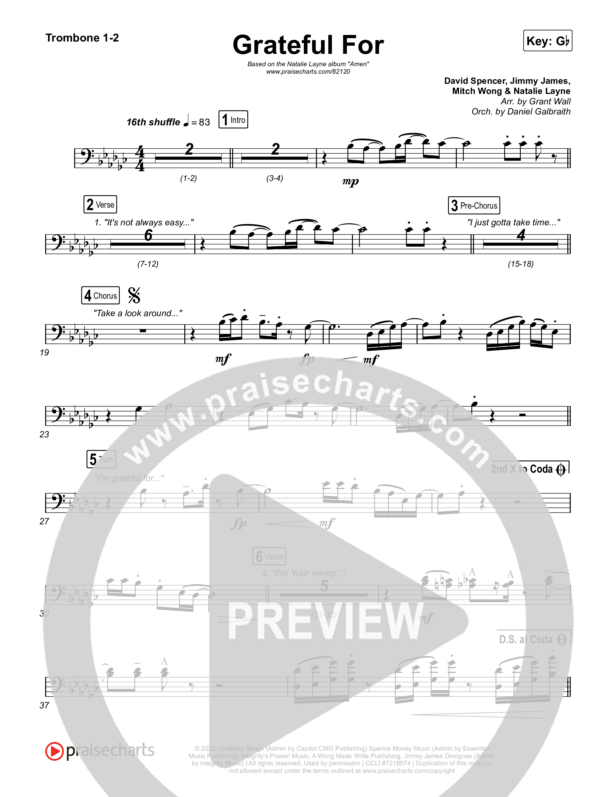 Download the Trombone 1,2 sheet music for Grateful For by Natalie Layne, from the album All Joy. This song was arranged by Grant Wall / Daniel Galbraith in the key of F, Gb.