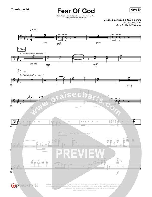 Download the Trombone 1,2 sheet music for Fear Of God by Brooke Ligertwood, from the album Eight. This song was arranged by Grant Wall / Daniel Galbraith in the key of E, Eb.