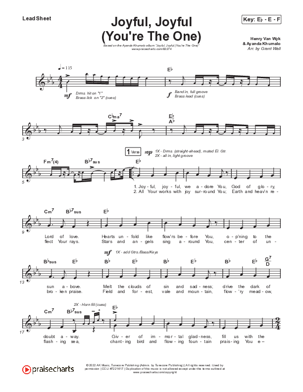 Download the sheet music for Joyful Joyful (You're the One) by Ayanda Khumalo, from the album Joyful Joyful (You're the One). This song was arranged by Grant Wall in the key of D, Eb.