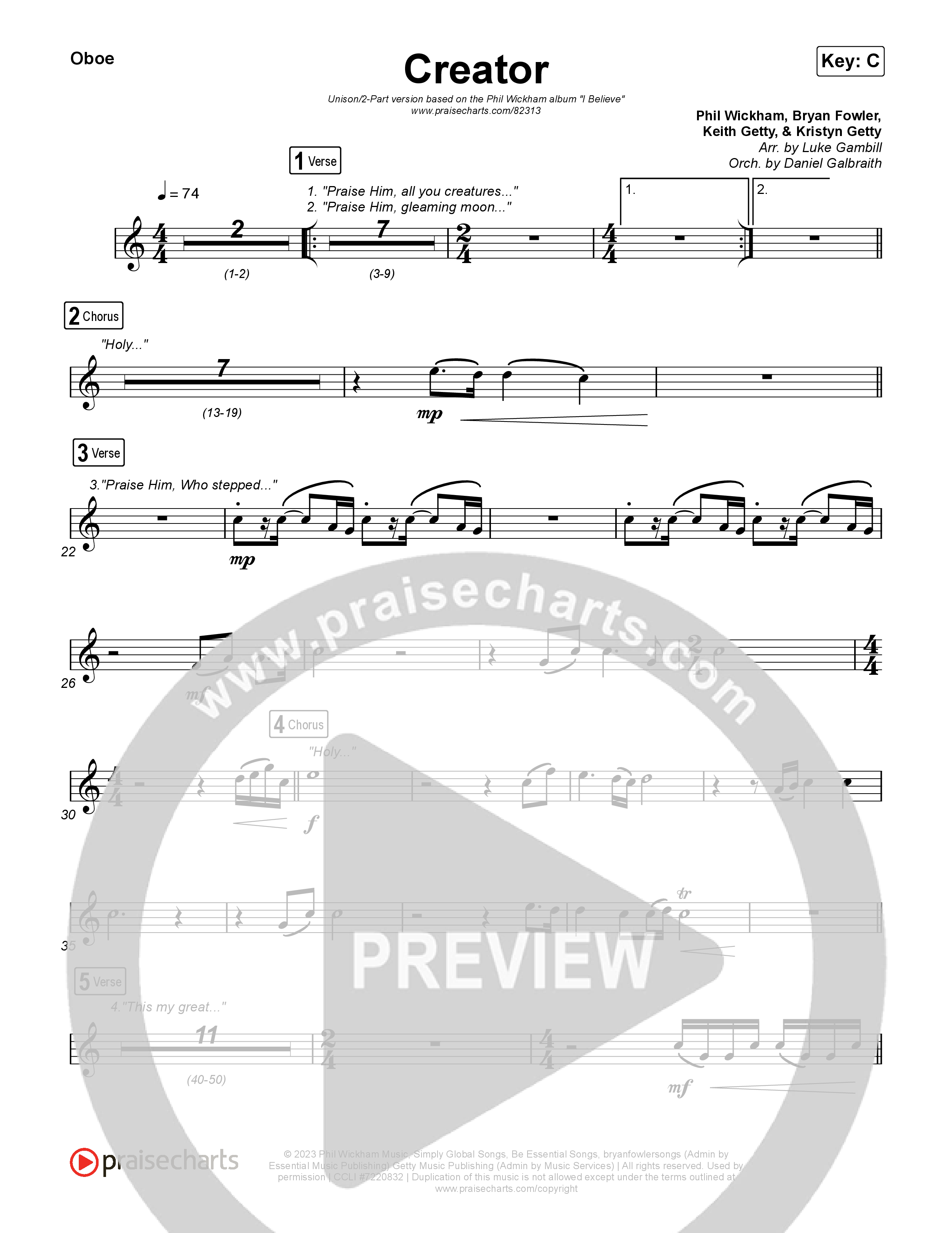 Download the Oboe sheet music for Creator (Unison/2-Part) by Phil Wickham, from the album I Believe. This song was arranged by Daniel Galbraith in the key of C.
