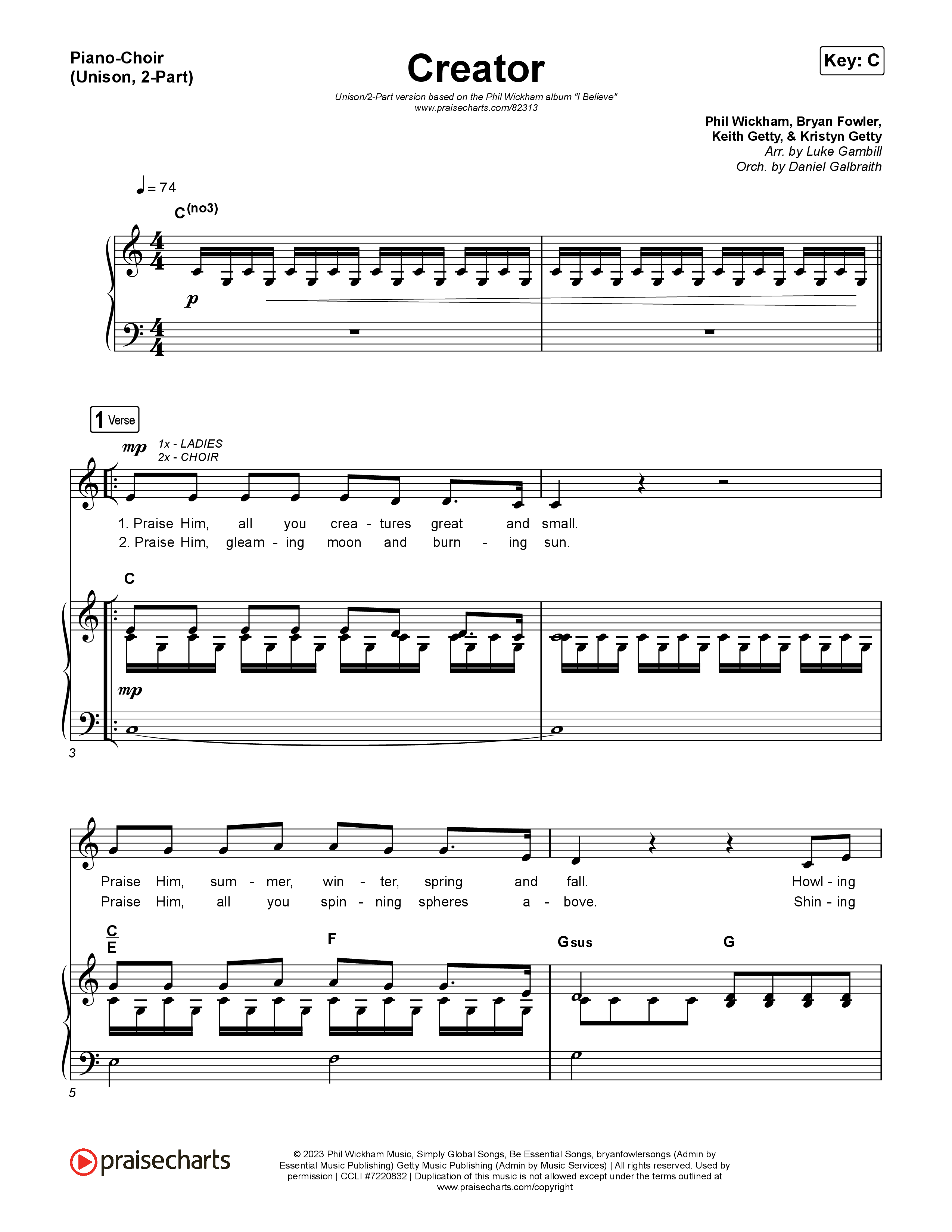 Download the PDF sheet music for Creator (Unison/2-Part) by Phil Wickham, from the album I Believe. This song was arranged by Daniel Galbraith in the key of C.