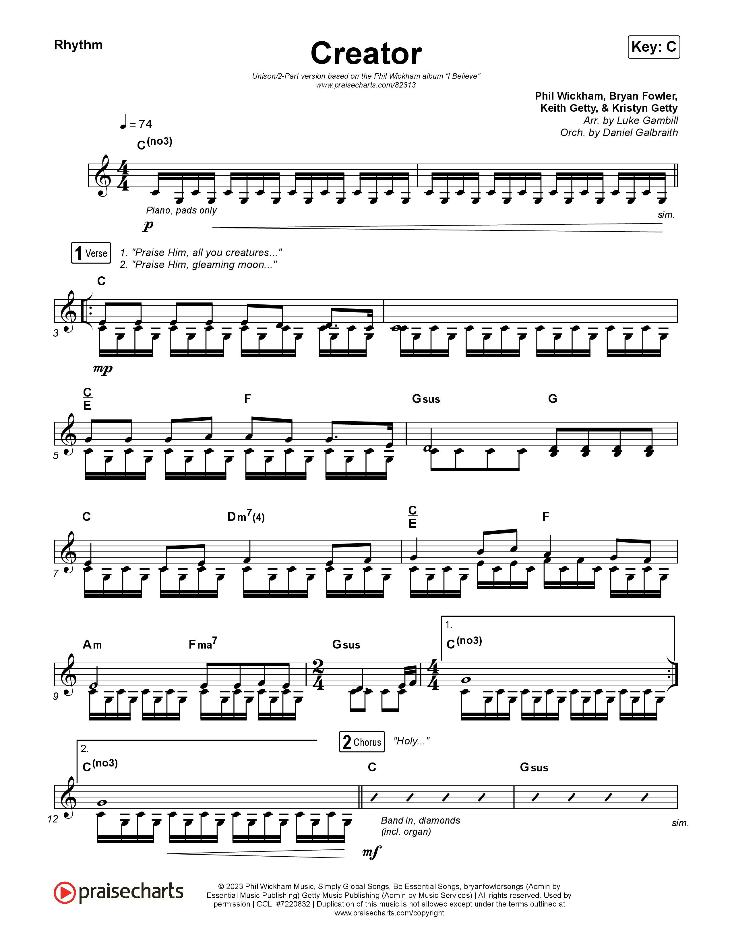 Download the Rhythm Chart for Creator (Unison/2-Part) by Phil Wickham, from the album I Believe. This song was arranged by Daniel Galbraith in the key of C.