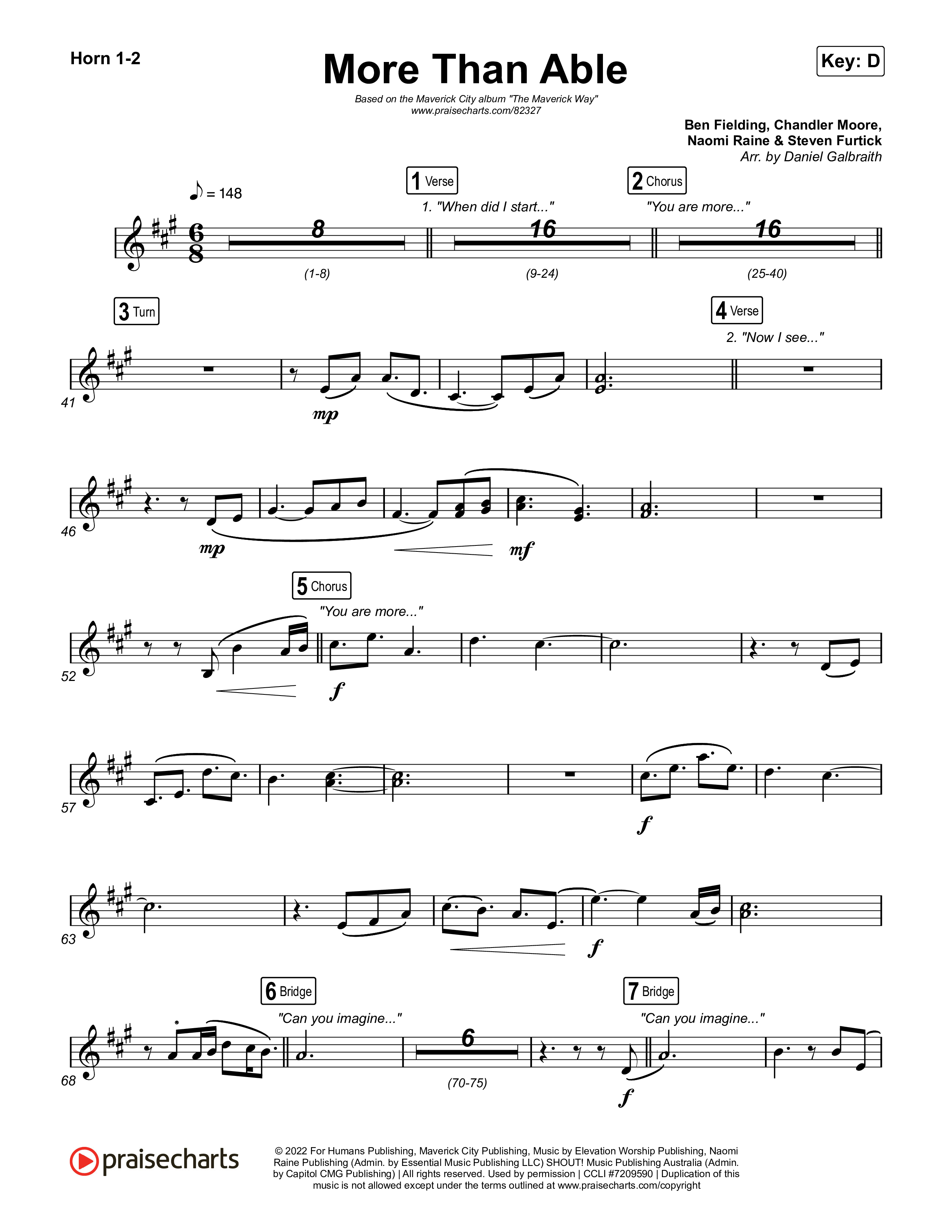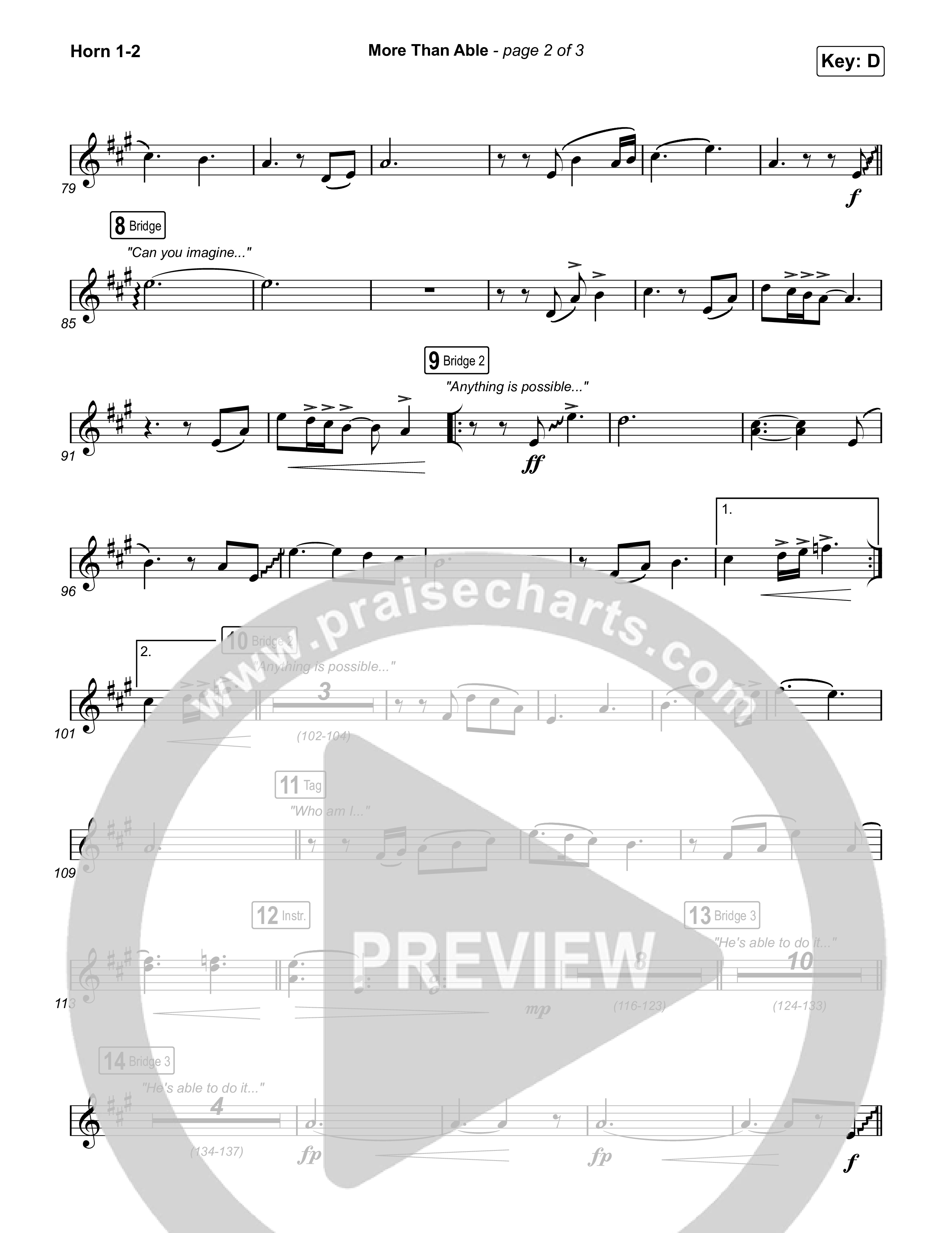 Download the Orchestration brass parts for More Than Able by Maverick City Music / Tasha Cobbs Leonard, from the album The Maverick Way. This song was arranged by Daniel Galbraith in the key of D, Eb.