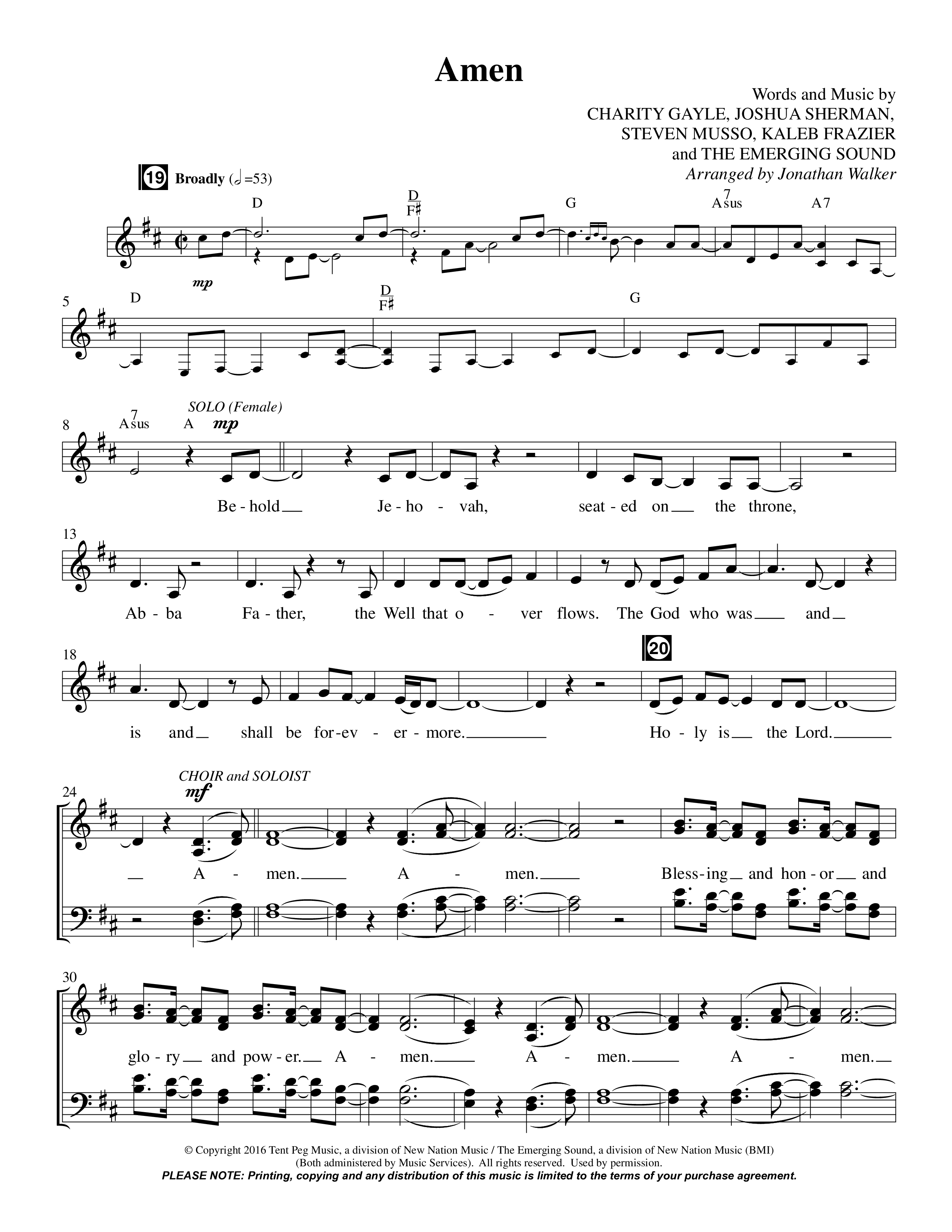 Download the Choir Sheet for Amen (Choral Anthem SATB) by Prestonwood Worship / Prestonwood Choir / Arr. Jonathan Walker, from the album Horizon. This song was arranged by Jonathan Walker in the key of D.
