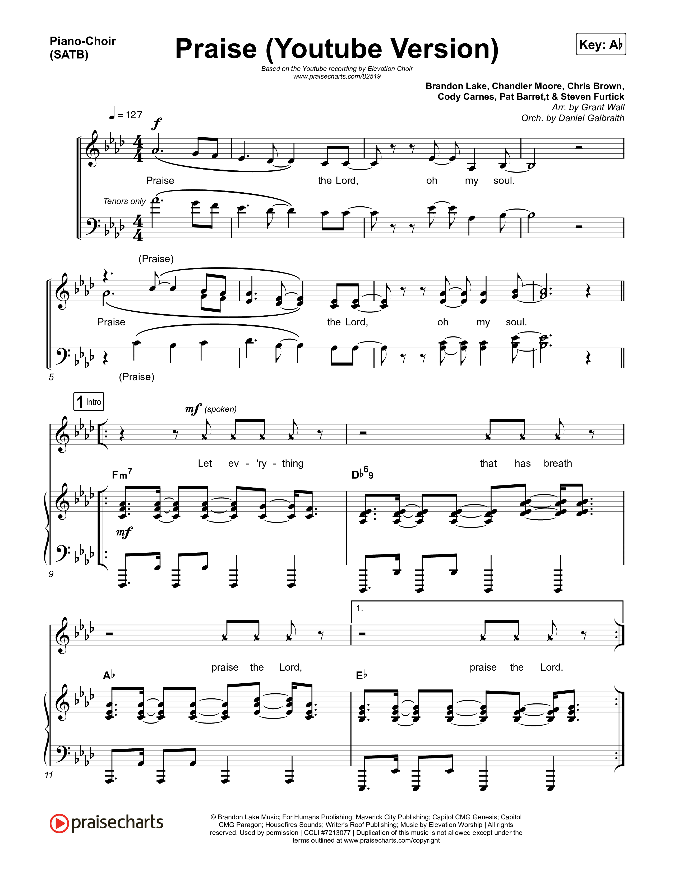 Download the PDF sheet music for Praise by Elevation Worship / Elevation Choir, from the album Praise. This song was arranged by Grant Wall / Daniel Galbraith in the key of Ab, G.