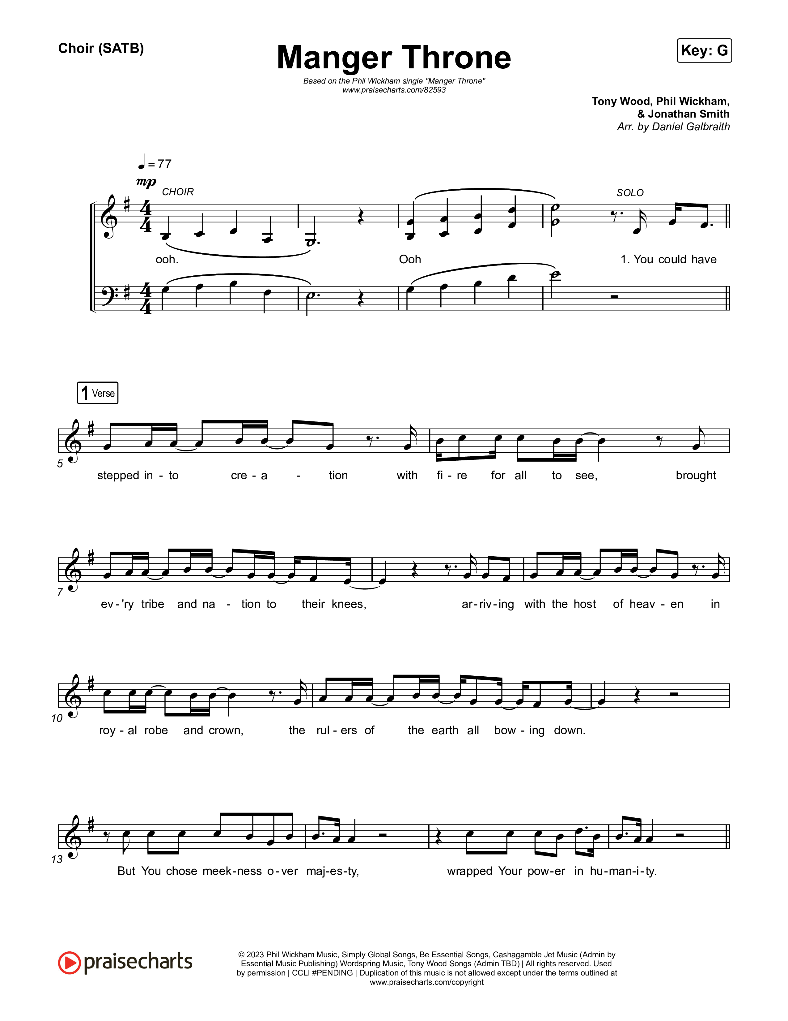 Download the Choir Sheet for Manger Throne by Phil Wickham, from the album Hallelujah! It's Christmas!. This song was arranged by Daniel Galbraith in the key of E, F, G.