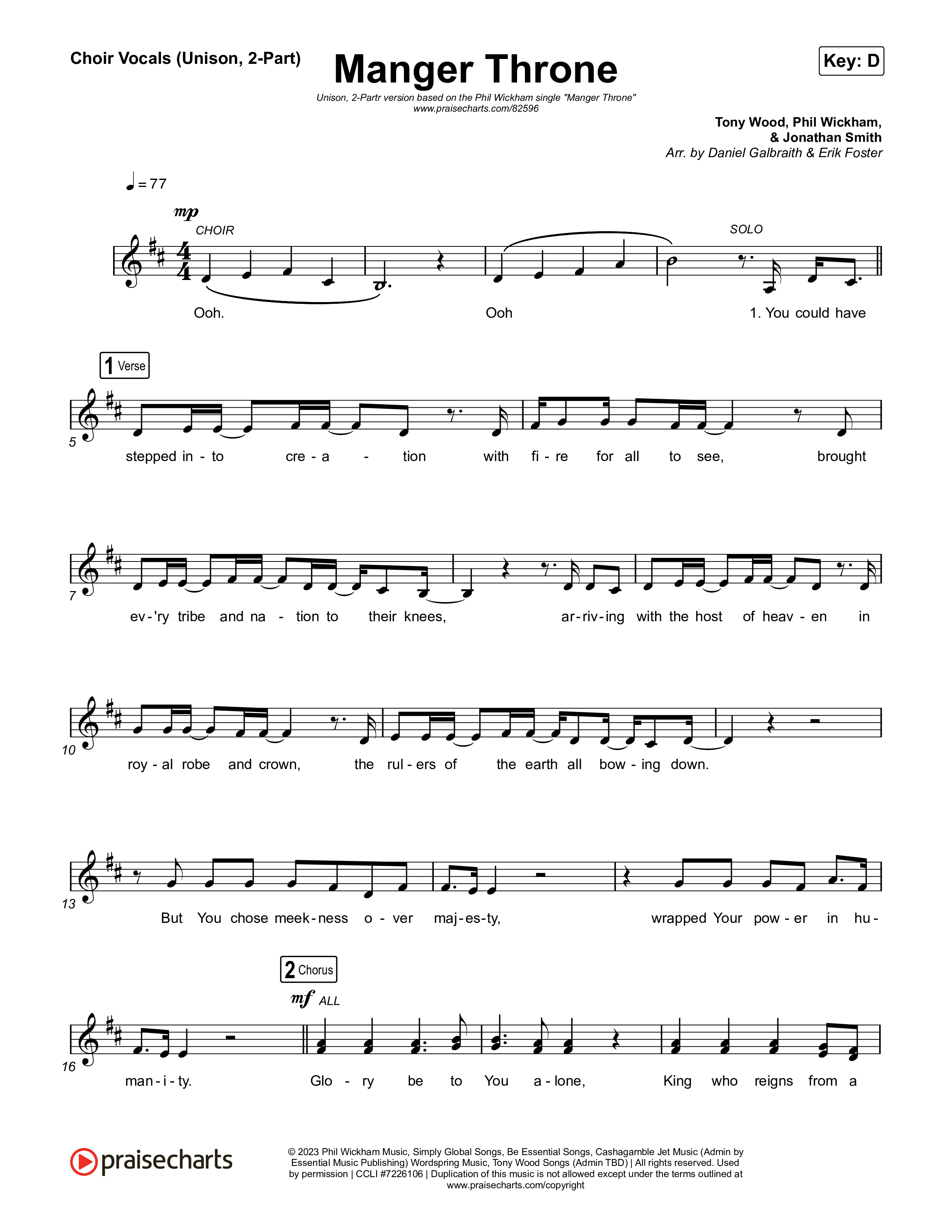 Download the PDF sheet music for Manger Throne (Unison/2-Part) by Phil Wickham / Arr. Erik Foster, from the album Manger Throne. This song was arranged by Erik Foster / Daniel Galbraith in the key of D.
