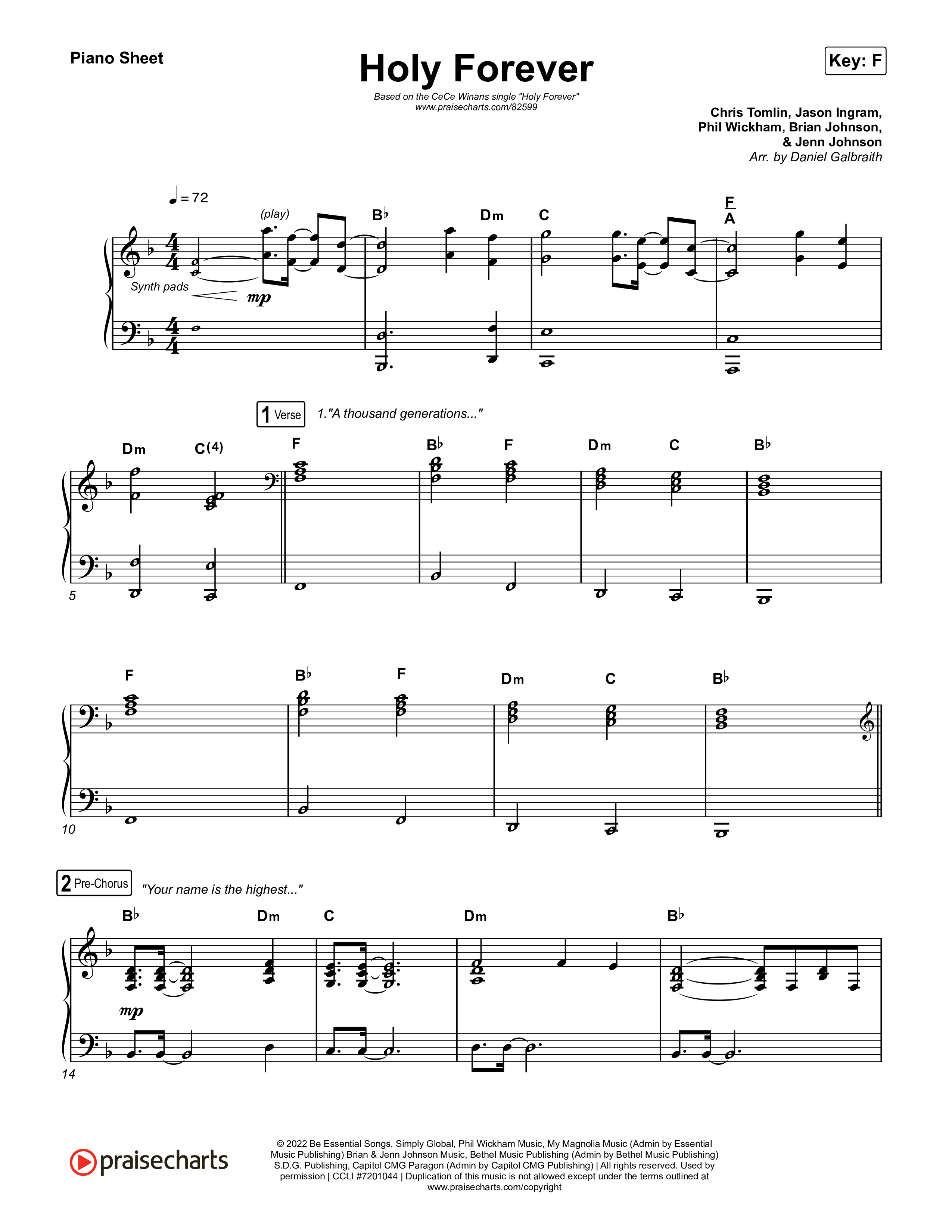 Download the piano sheet for Holy Forever (Single Version) by CeCe Winans, from the album More Than This. This song was arranged by Daniel Galbraith in the key of F, G, Gb.