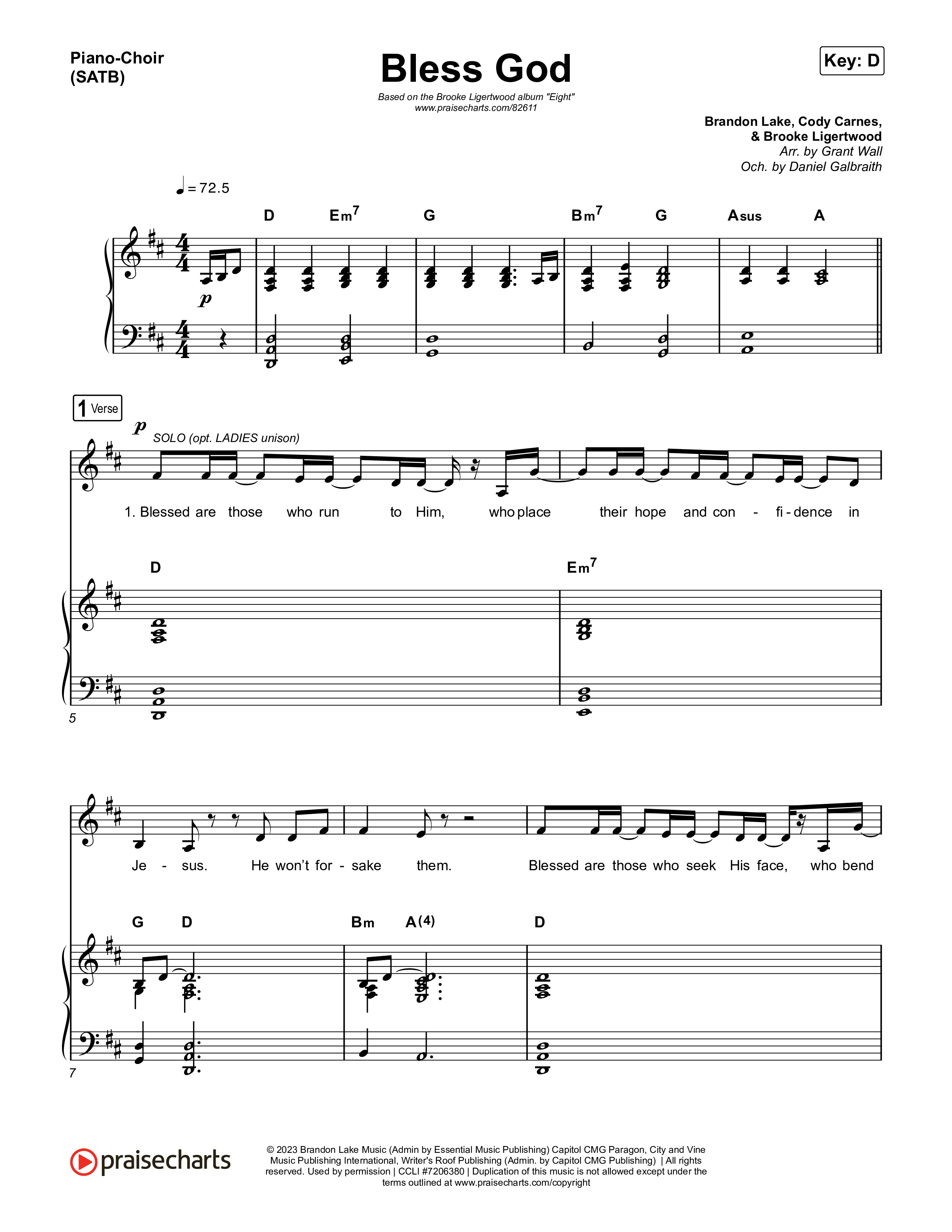 Download the PDF sheet music for Bless God by Brooke Ligertwood, from the album Eight. This song was arranged by Grant Wall / Daniel Galbraith in the key of D, Eb.
