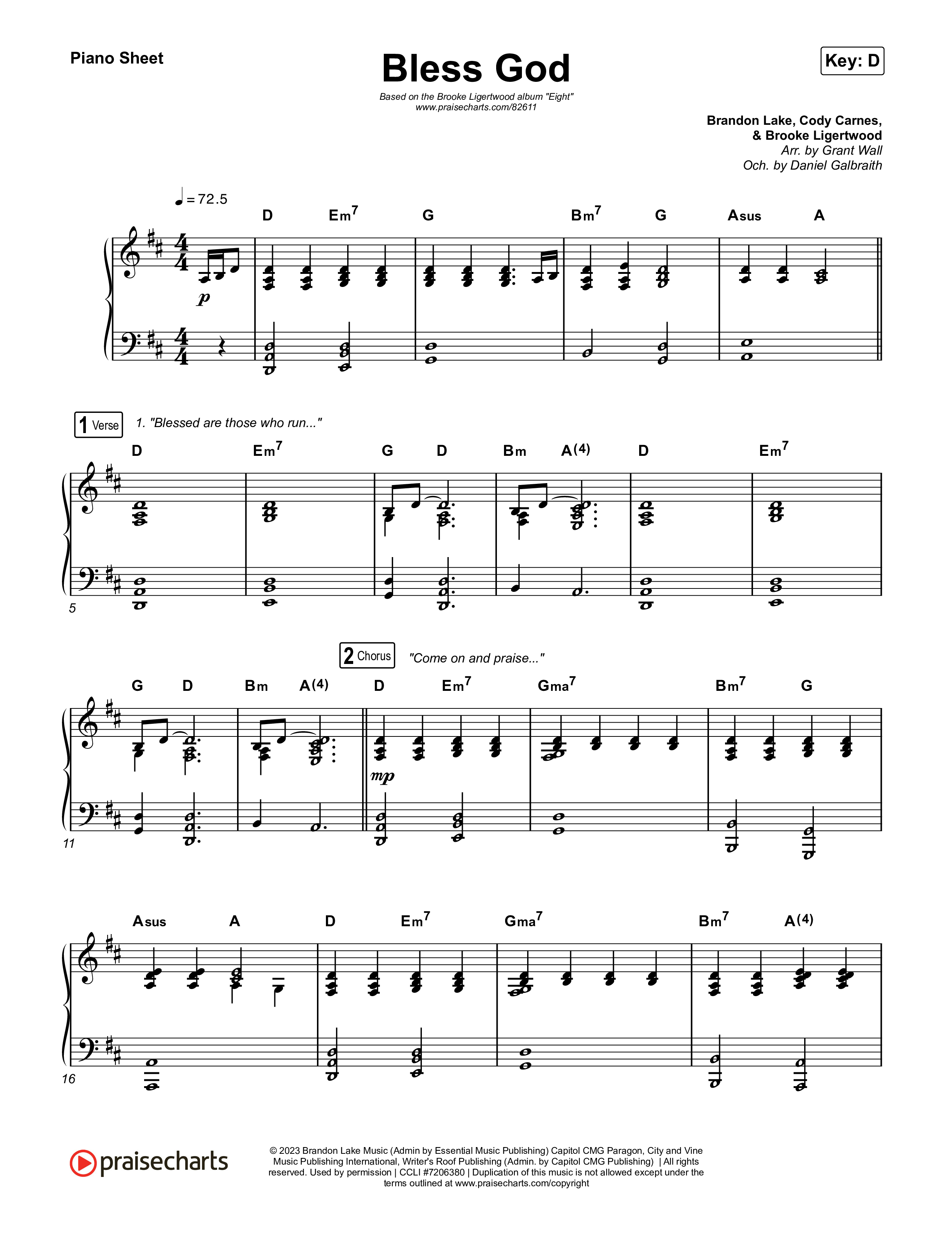Download the piano sheet for Bless God by Brooke Ligertwood, from the album Eight. This song was arranged by Grant Wall / Daniel Galbraith in the key of D, Eb.