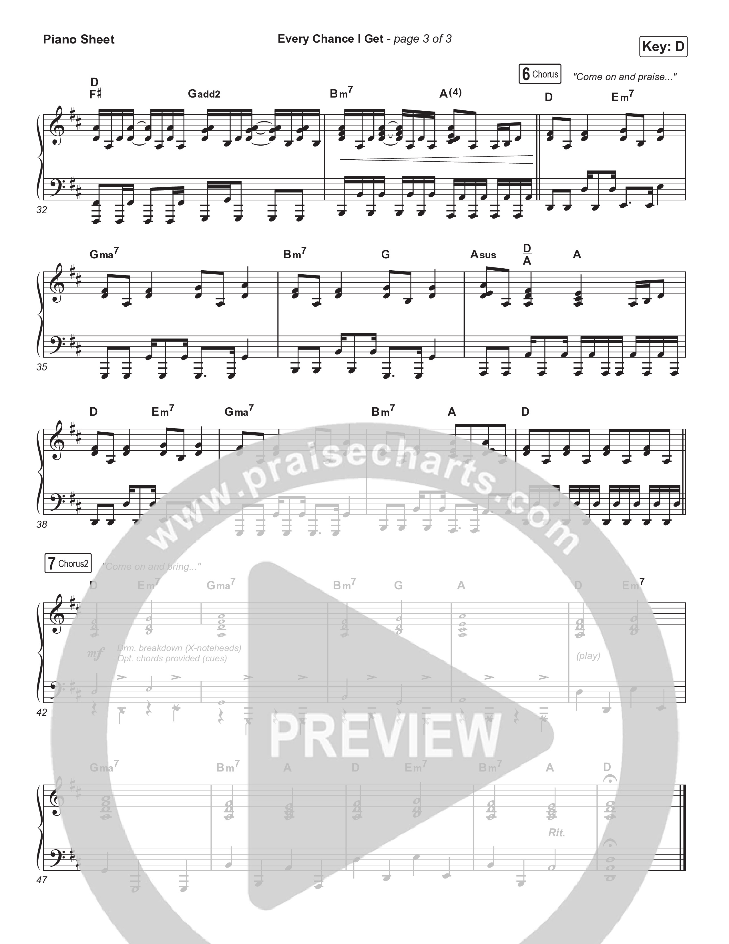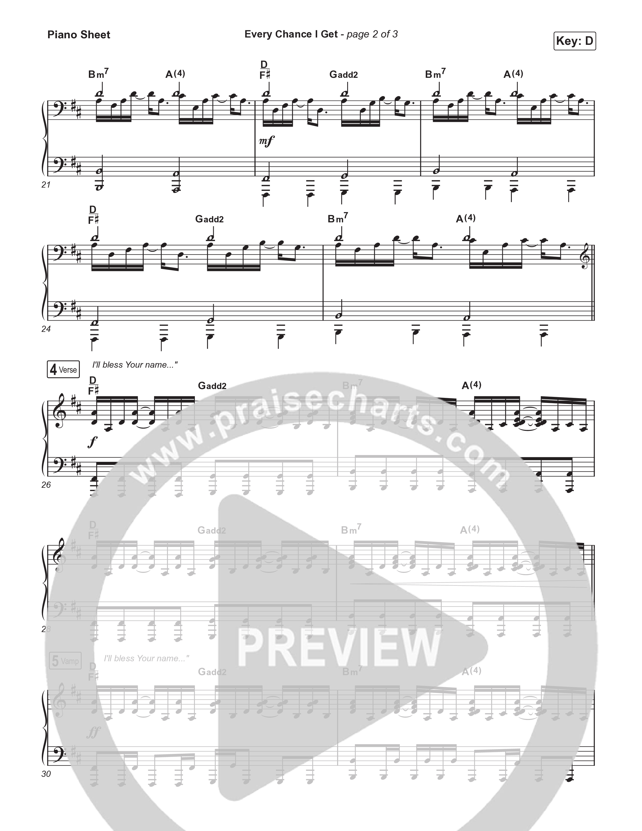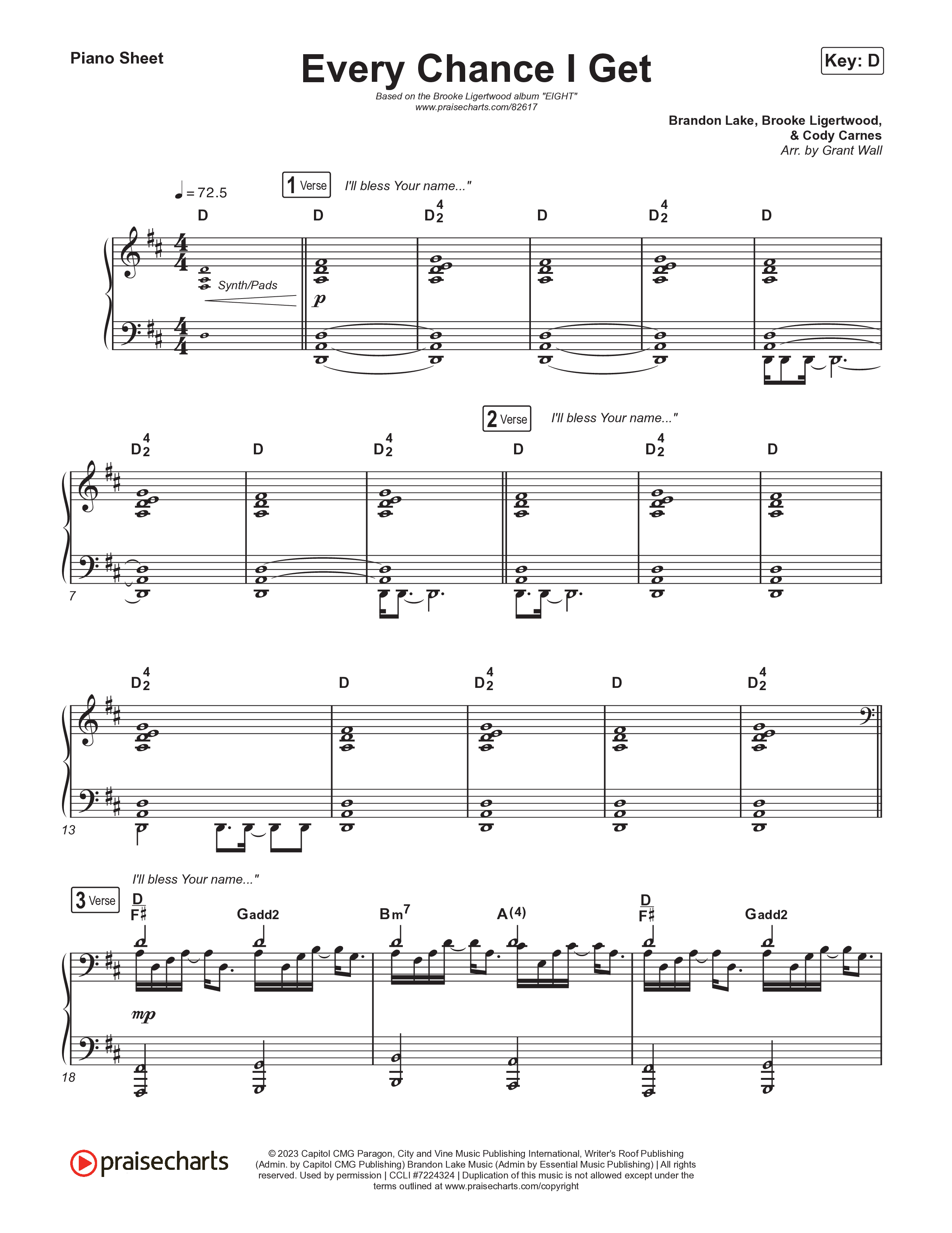Download the piano sheet for Every Chance I Get by Brooke Ligertwood, from the album Eight. This song was arranged by Grant Wall in the key of D, Eb.