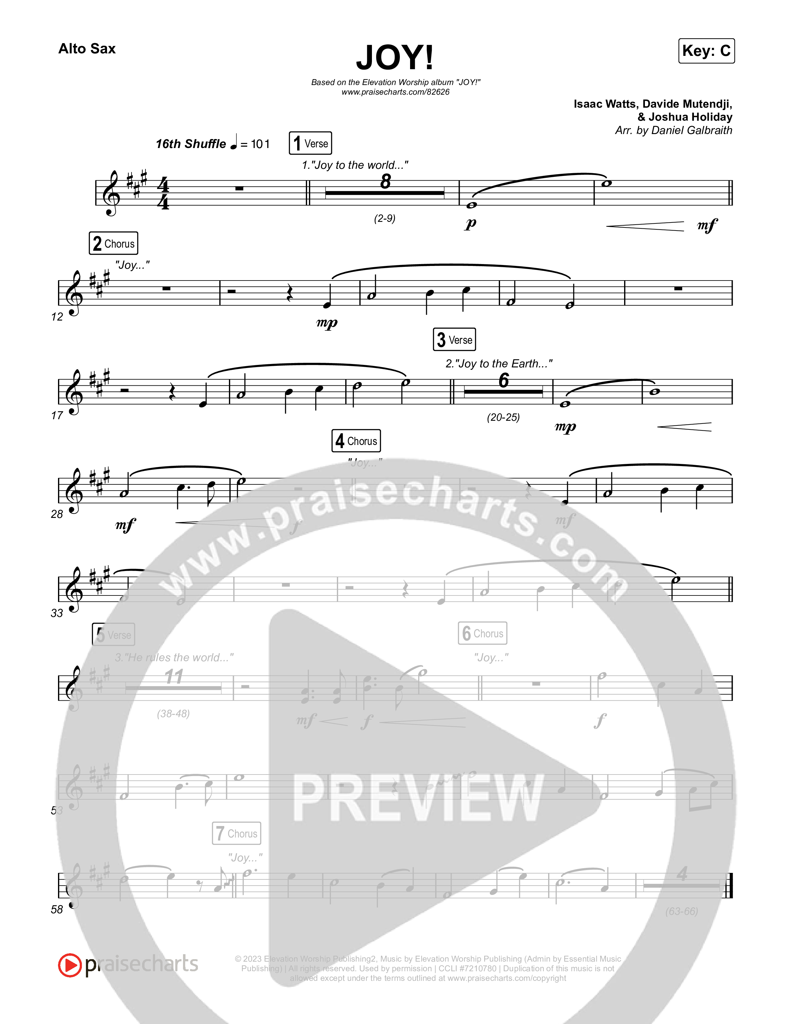 Download the Saxaphone instruments PDF sheet music for JOY! by ELEVATION RHYTHM / Elevation Worship, from the album JOY!. This song was arranged by Daniel Galbraith in the key of Bb, C.