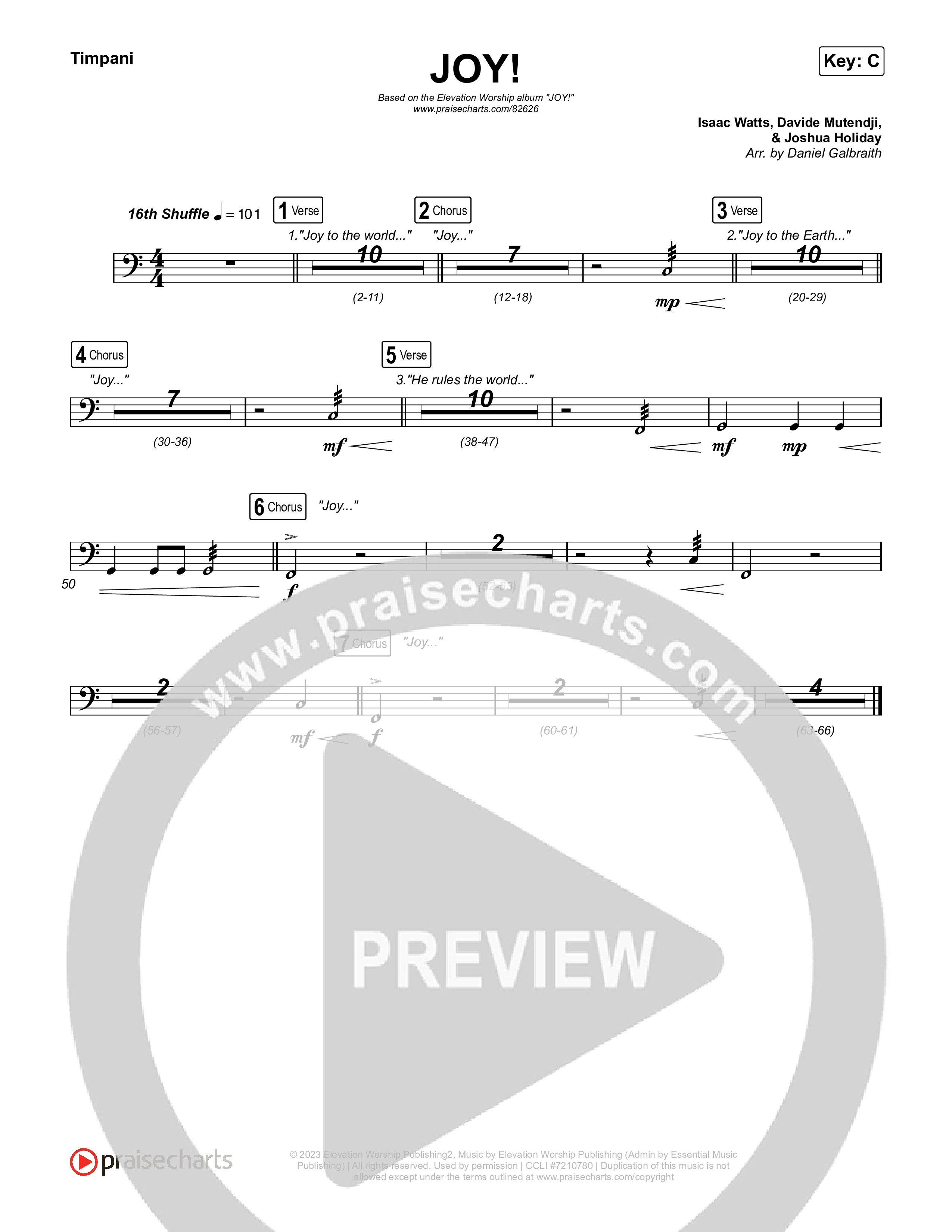 Download the Timpani sheet music for JOY! by ELEVATION RHYTHM / Elevation Worship, from the album JOY!. This song was arranged by Daniel Galbraith in the key of Bb, C.